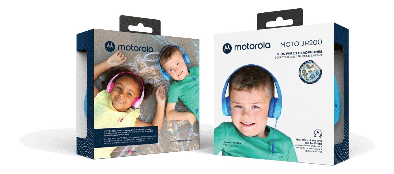 On-ear-hodetelefoner for barn fra Motorola med lydbegrensning på 85 desibel. Hodetelefonene kan justeres i størrelse, noe som betyr at de også passer når barnet vokser. Hodetelefonene kan enkelt tilkobles en smarttelefon eller et nettbrett med en 1 meter lang 3,5 mm kabel. Hodetelefonene har innebygd mikrofon på ledningen.