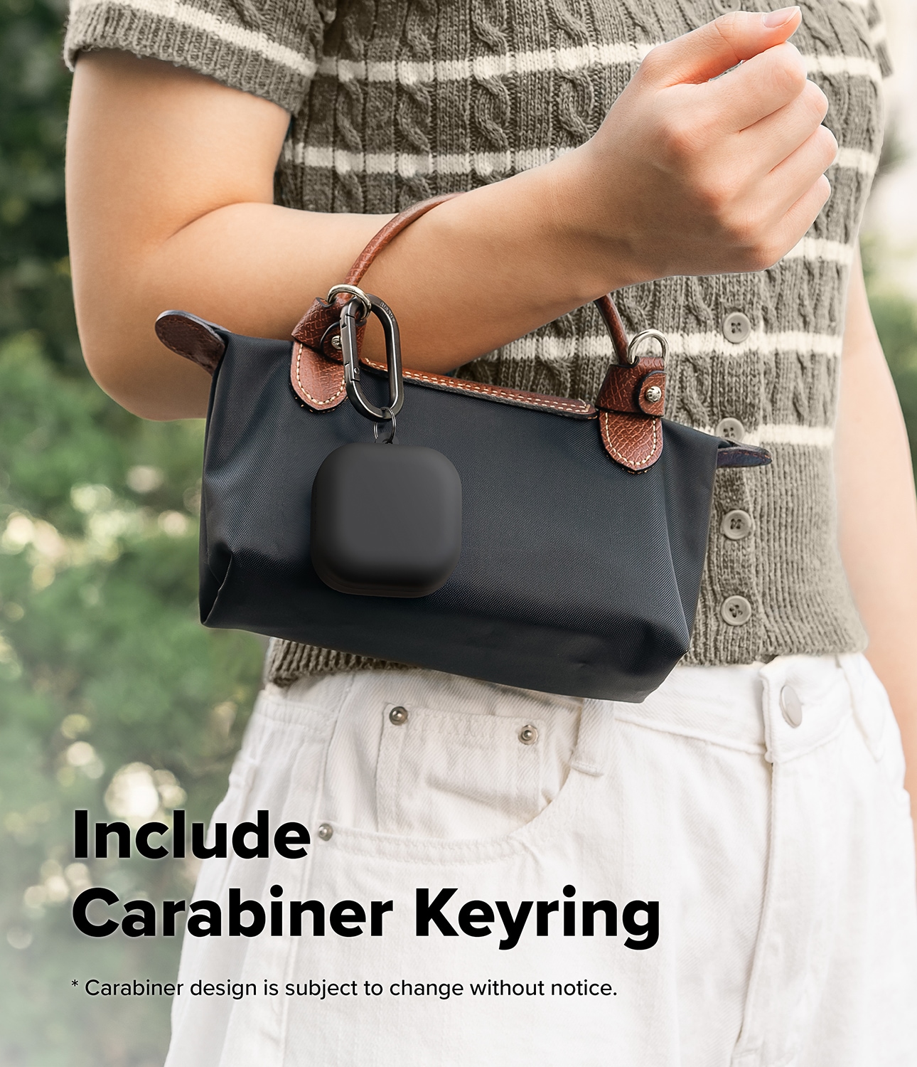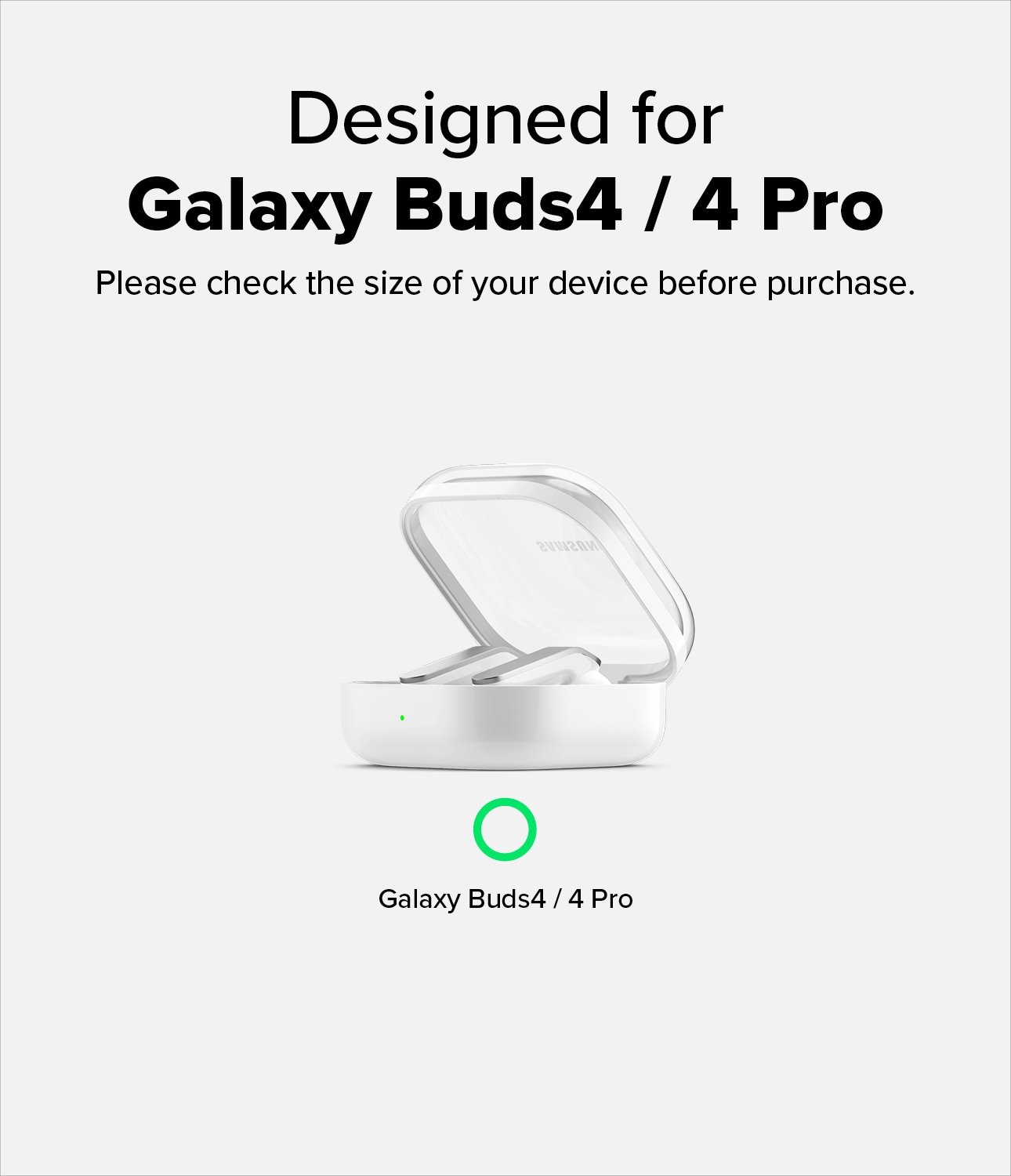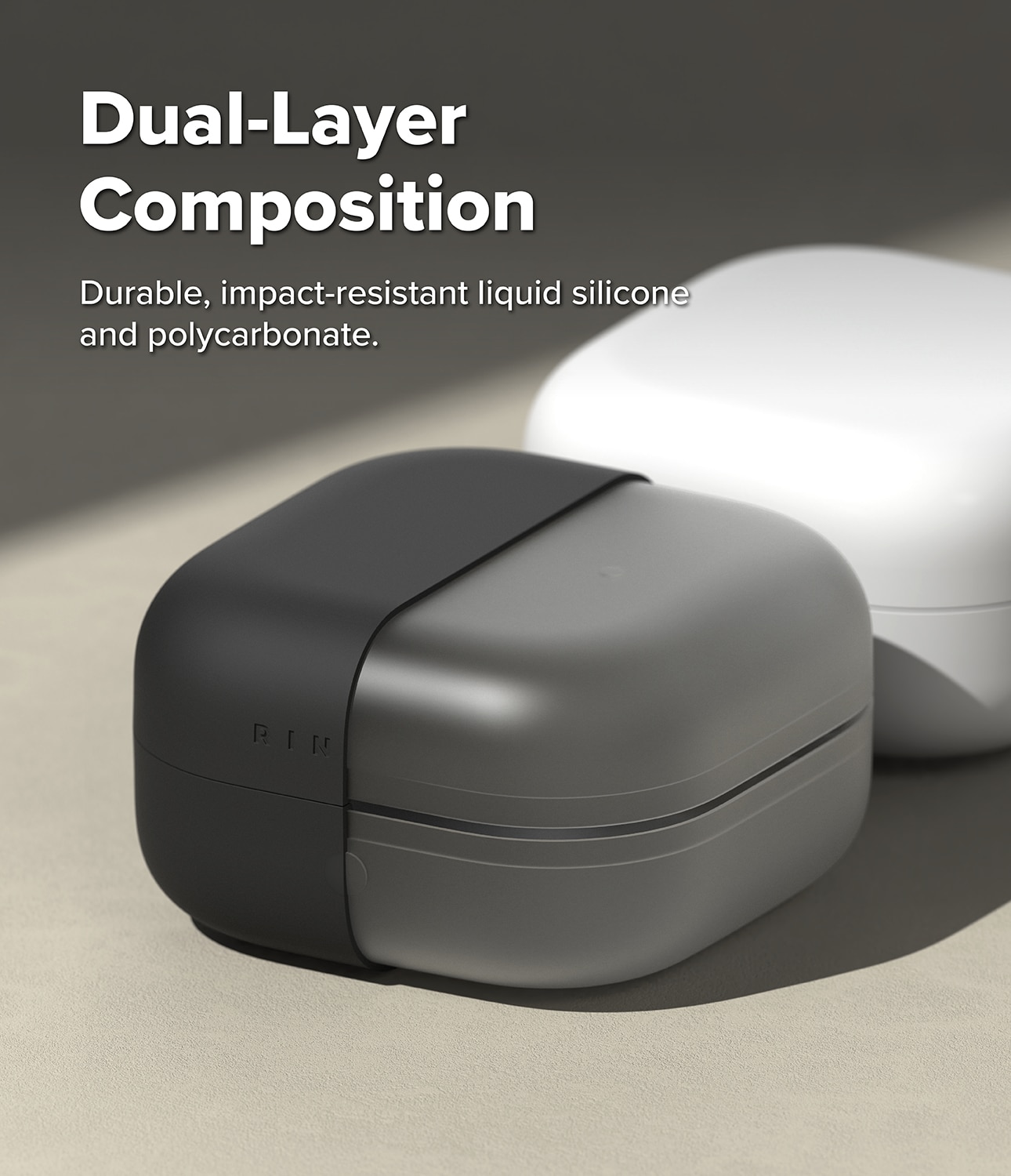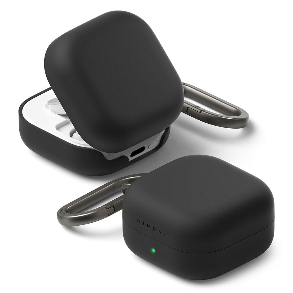 Stilrent silikondeksel med karabinkrok til Samsung Galaxy Buds 4 fra Ringke. Dekselet har en slank design, men er fortsatt støtdempende for å beskytte mot skader. Det er laget av høykvalitets flytende silikon med en overflate som både føles luksuriøs og gir god beskyttelse. Dekselet har et tolagsdesign med en sterk polykarbonatramme på innsiden og silikon på utsiden.