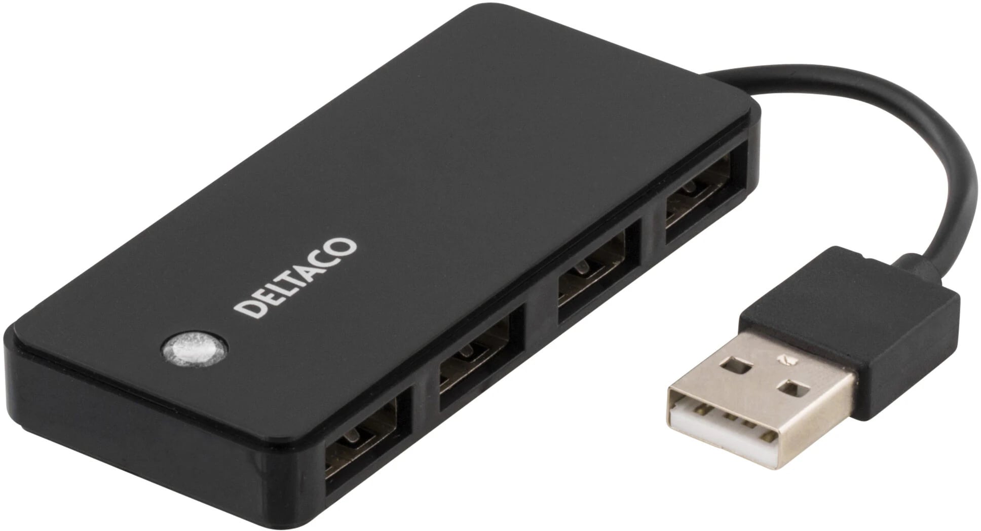 Denne kompakte USB-hubben fra Deltaco gir deg fire ekstra USB-A-porter, perfekt for å enkelt koble til flere enheter samtidig. Med USB 2.0-tilkobling får du stabil og effektiv dataoverføring, og hubben har en LED-indikator som viser når den er koblet til en enhet.
