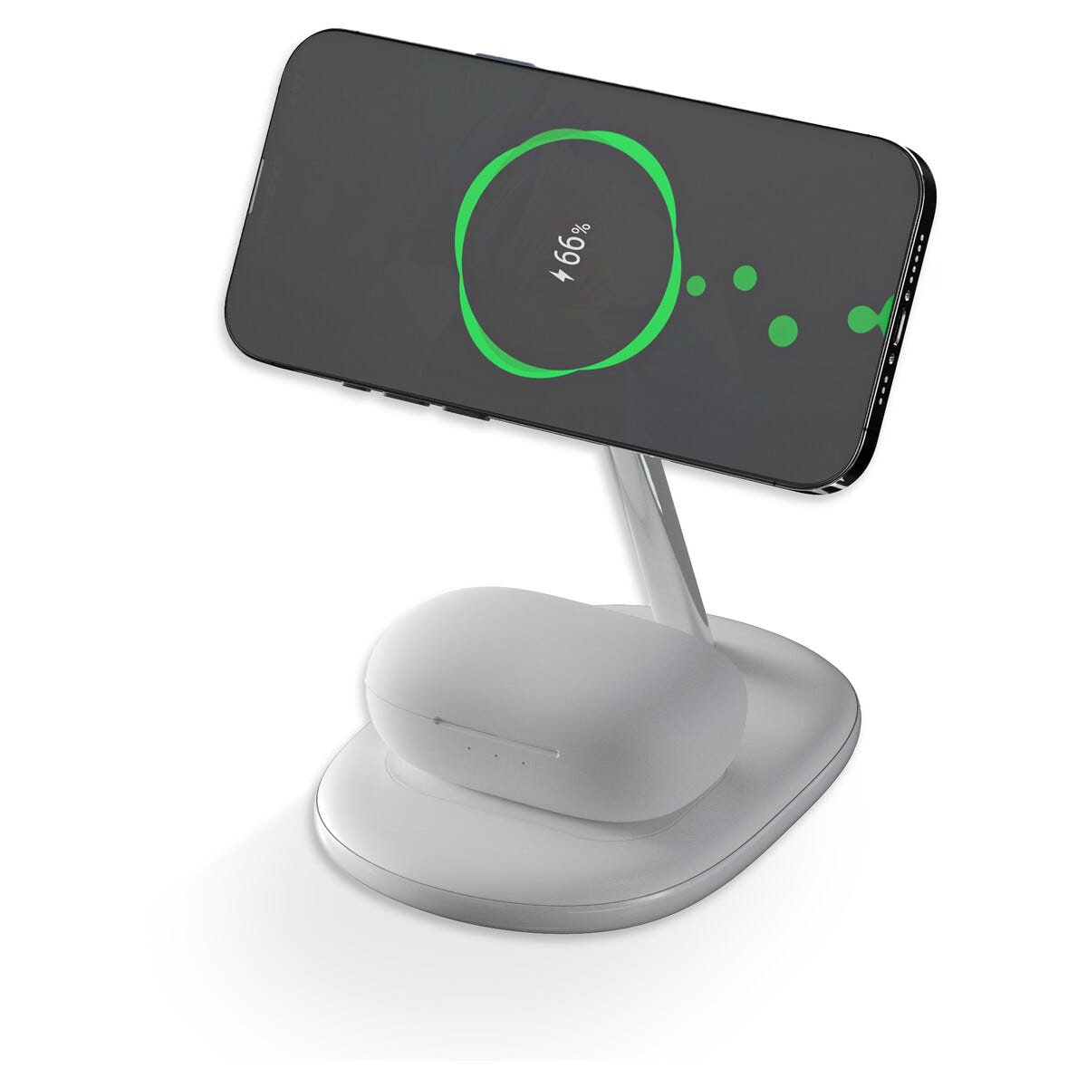 Trådløs magnetisk Qi2 ladestasjon 2-i-1 gjør det enkelt å lade mobiltelefon og hodetelefoner samtidig. Med støtte for Qi2-teknologi og MagSafe-kompatibilitet får kompatible iPhone-modeller stabil plassering og effektiv hurtiglading med opptil 15 W effekt. Den integrerte ladeplaten gir praktisk lading av AirPods eller andre trådløse TWS-hodetelefoner parallelt. Den praktiske stativutformingen gjør det mulig å bruke telefonen i video- eller samtalemodus under lading. Den kompakte og stilrene formen gjør ladestasjonen egnet på skrivebordet, nattbordet eller arbeidsplassen.