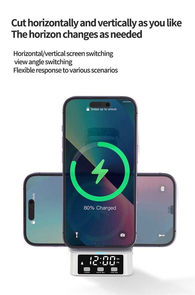 SiGN 3-i-1 trådløs ladestasjon med vekkerklokke 15W er en praktisk og plassbesparende løsning for å lade smarttelefon, Apple Watch og trådløse hodetelefoner samtidig. Den integrerte digitale klokken med alarmfunksjon gjør ladestasjonen ideell for nattbordet eller skrivebordet, slik at du enkelt kan holde oversikt over både enhetene og tiden.