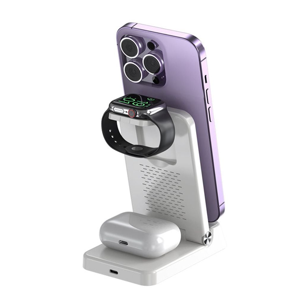 Ladestasjonen støtter trådløs hurtiglading opptil 15W for smarttelefoner og har dedikerte ladeflater for Apple Watch og hodetelefoner. Du kan plassere mobilen både vertikalt og horisontalt under lading, noe som gjør det enkelt å bruke enheten sa... Les mer