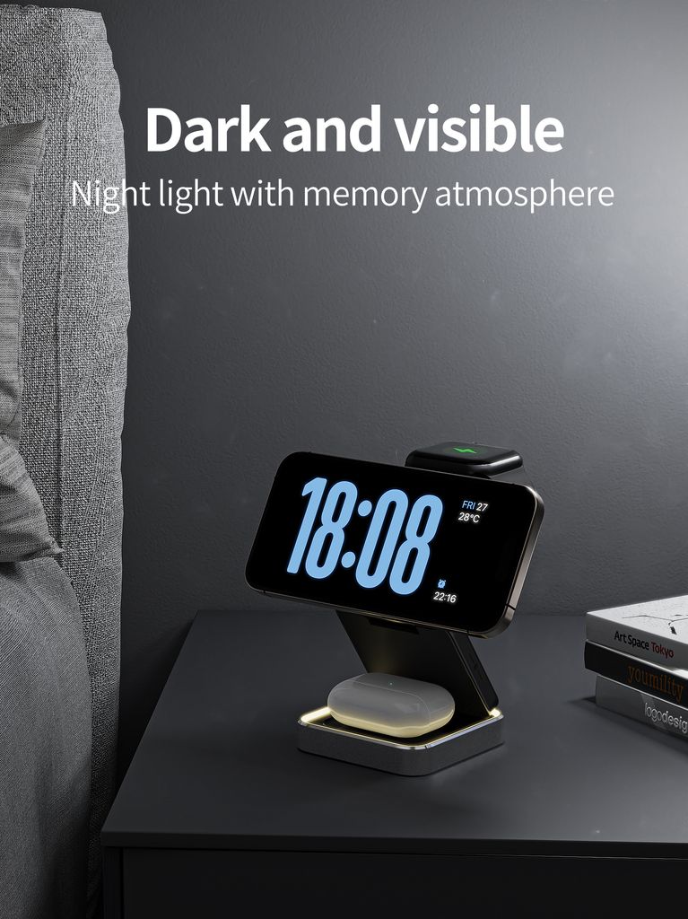 Den magnetiske ladeflaten sikrer stabil plassering og gjør det mulig å bruke mobilen både vertikalt og horisontalt under lading. Ladestasjonen støtter trådløs hurtiglading opptil 15W for smarttelefoner samt dedikerte ladeområder for smartklokke og hodetelefone... Les mer