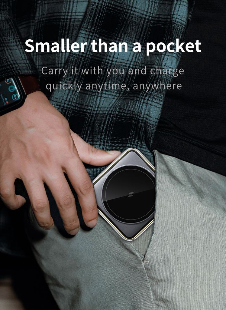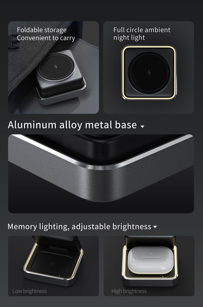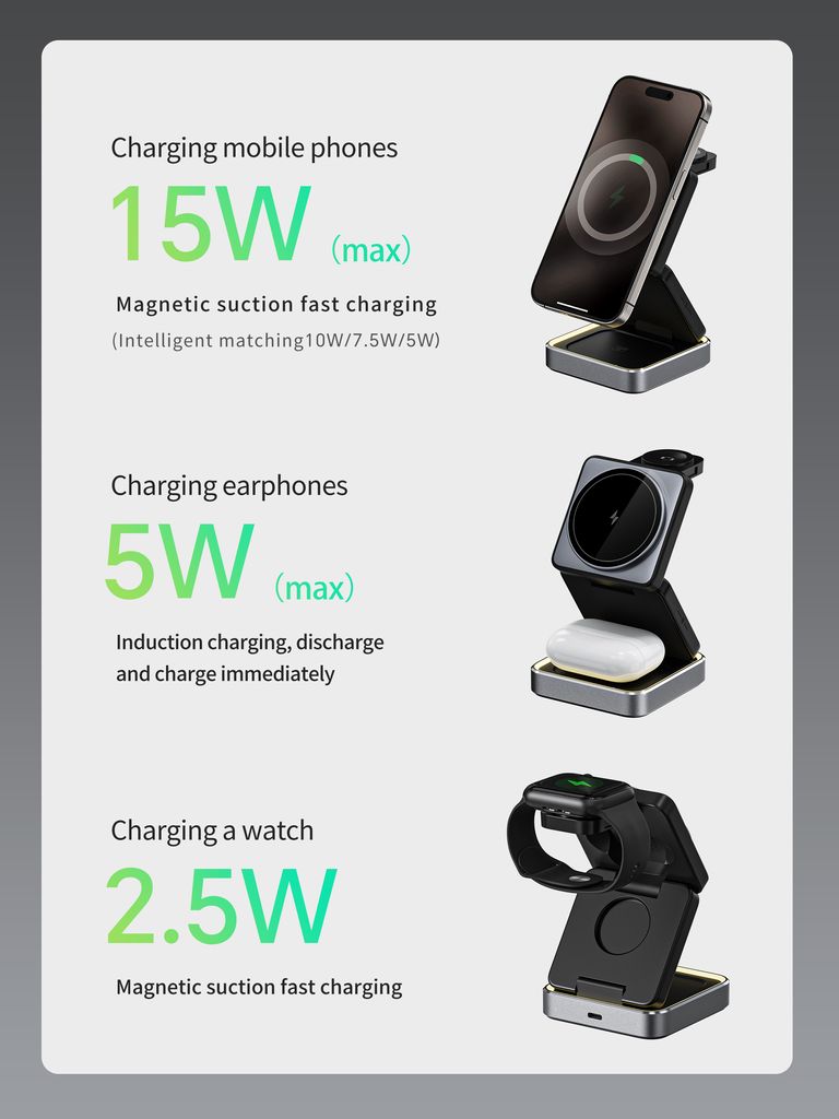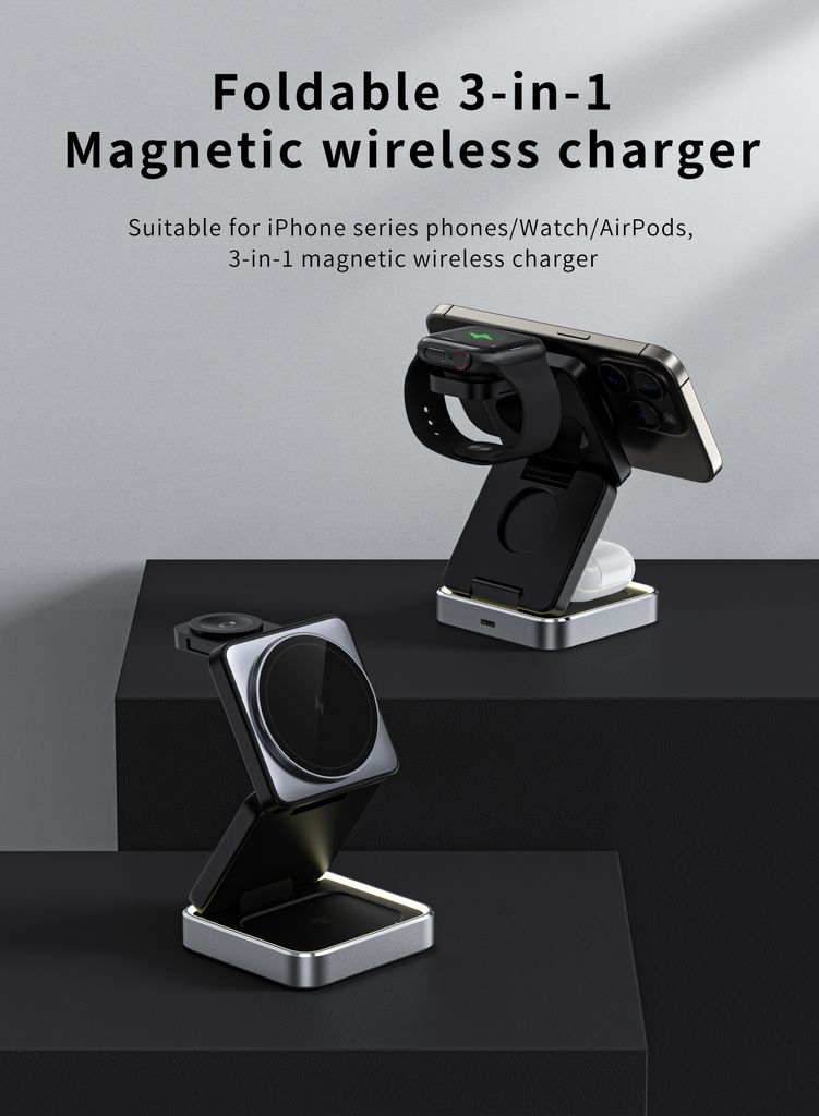 SiGNs 3-i-1 sammenleggbare trådløse magnetiske ladestasjon 15W er en praktisk og kompakt løsning for å lade smarttelefon, Apple Watch og trådløse hodetelefoner samtidig. Den sammenleggbare designen gjør ladestasjonen enkel å ta med på reiser eller bruke både hjemme og på kontoret, samtidig som den sparer plass på skrivebordet.