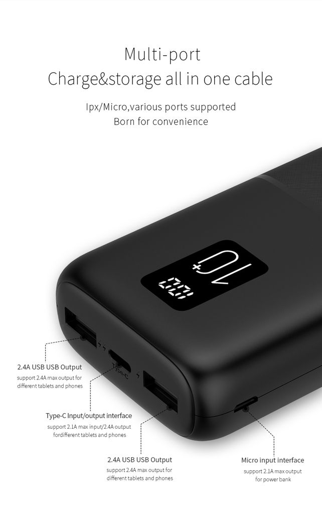 Den tydelige LED-skjermen viser nøyaktig gjenværende batteriprosent, noe som gir bedre kontroll over ladenivået og gjør det enkelt å vite når powerbanken må lades opp. Powerbanken har to USB-A-porter o... Les mer