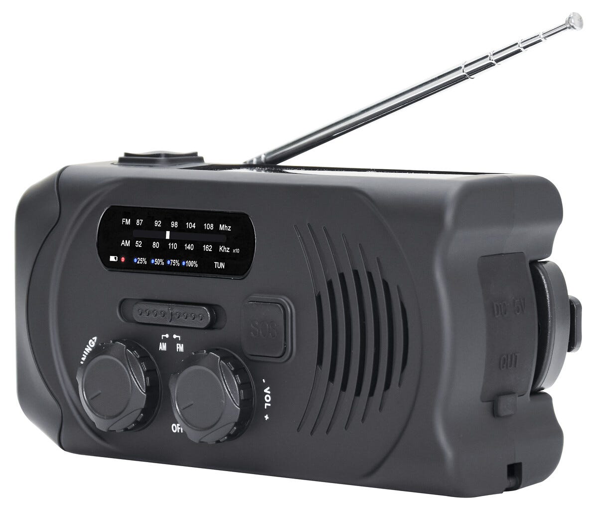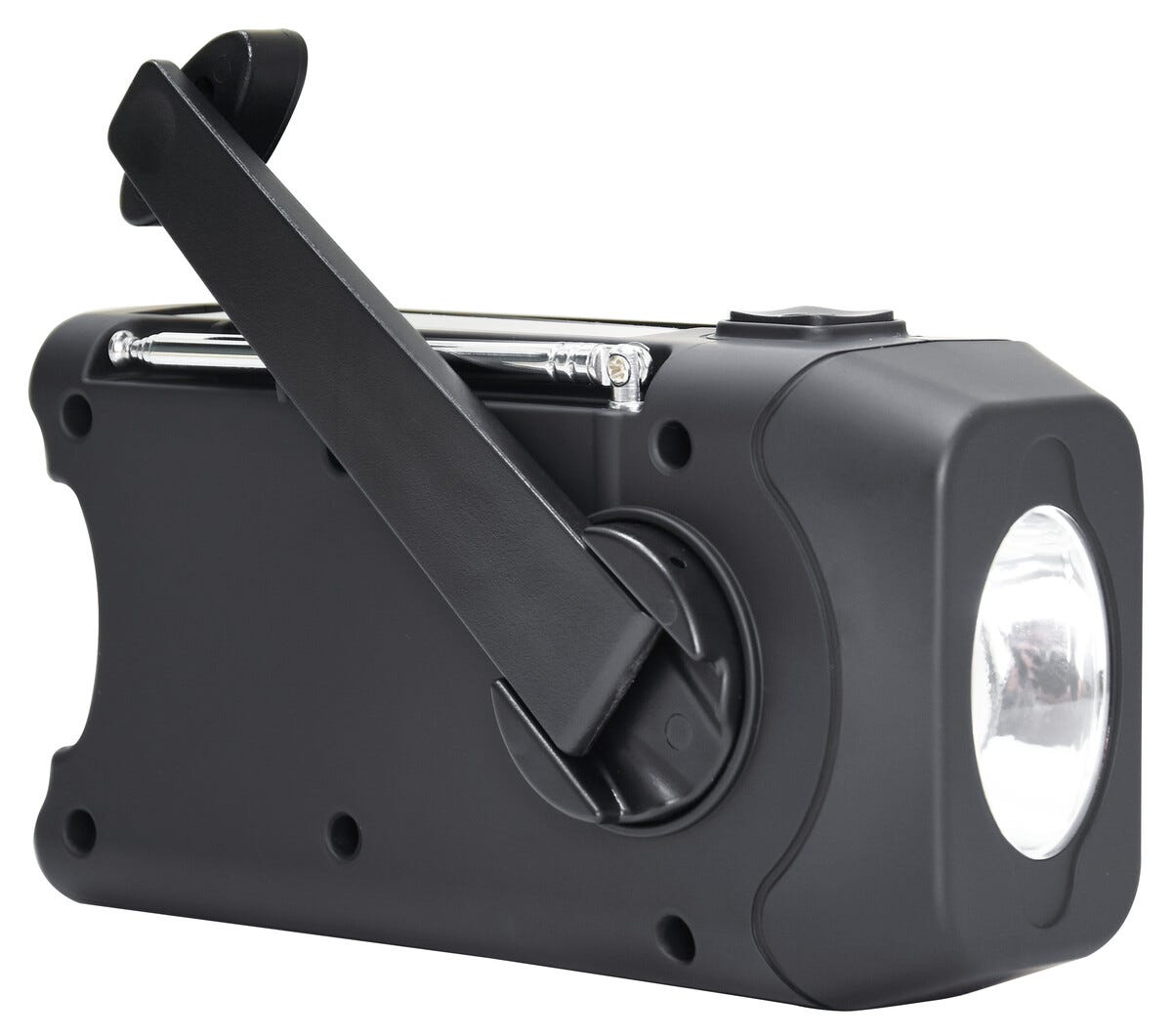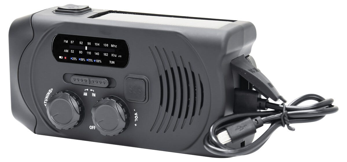 Exibel Nødradio med sveiv, solceller og powerbank er en praktisk dynamoradio som gir deg mulighet til å lytte til radio og få viktig informasjon på tur, under vandring eller i krisesituasjoner. Radioen kan lades manuelt med sveiv, via det innebygde solpanelet eller med USB-kabel før bruk. Den fungerer også som powerbank og har en USB-A-tilkobling for nødlading av mobiltelefon eller andre enheter. Det blinkende nødlyset og SOS-funksjonen med sirenelyd gjør at du kan bli sett og tilkalle hjelp ved behov. Kapslingsgrad IPX3 gjør at radioen kan brukes i lett regn.