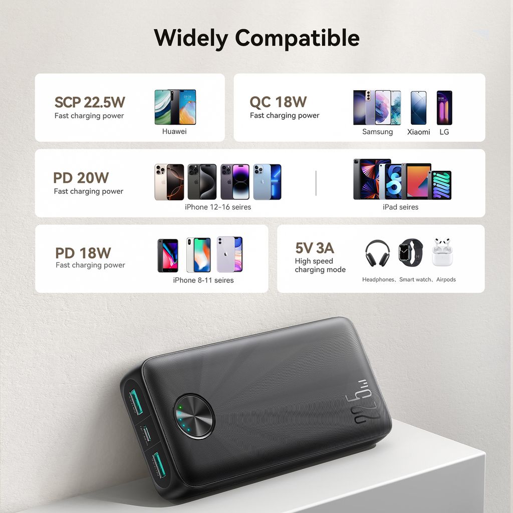 <p>Det integrerte LED-displayet viser tydelig gjenværende batterinivå i sanntid, noe som gir bedre kontroll over ladestatus. Powerbanken har én USB-C-port og to USB-A-porter, slik at du kan lade flere enheter samtidig. Den kompakte konstruksjonen gjør den enkel å ta med.</p>