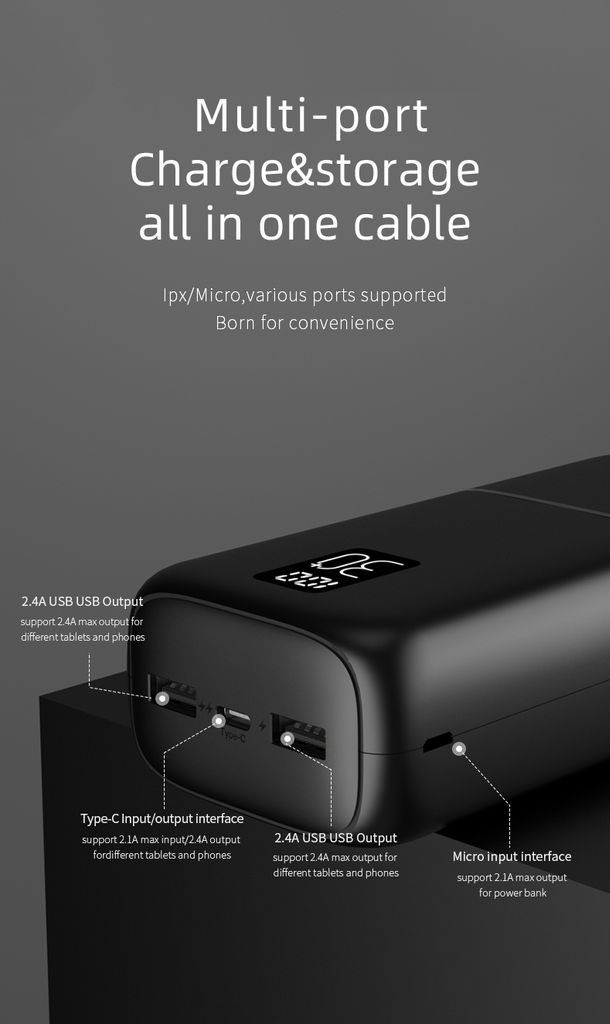 Powerbanken er utstyrt med én USB-C-port og to USB-A-porter, noe som gir deg fleksibilitet til å lade flere enheter samtidig. USB-A-portene støtter opptil 2.4A for rask og effektiv lading av mobiltelefon eller nettbrett. Powerbanken kan også lades via både USB-C og Micro-USB, noe som gjør den enkel og prak... Les mer