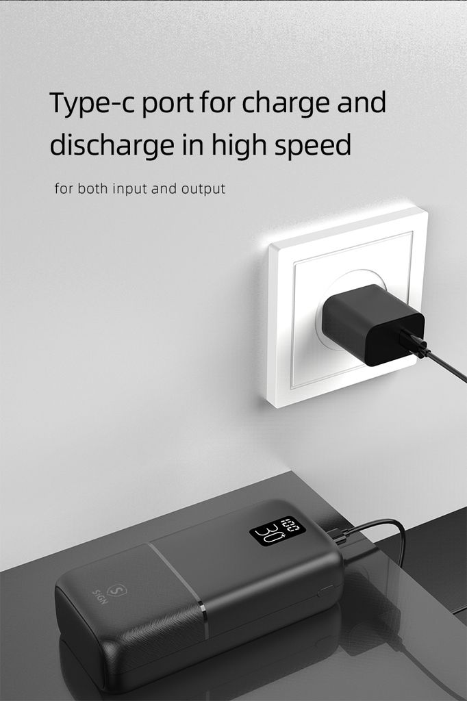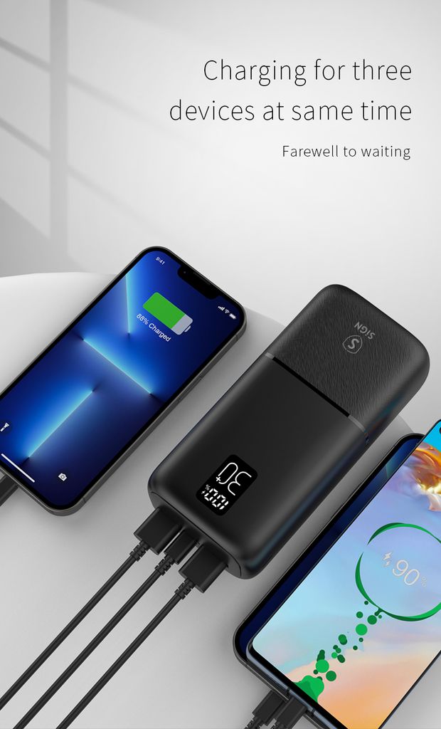 Med denne kraftige powerbanken fra SiGN kan du lade opptil tre enheter samtidig - en praktisk og pålitelig følgesvenn for reiser, arbeid og hverdagsbruk. Med en høy kapasitet på 30 000 mAh har du nok strøm til å lade telefonen flere ganger og holde enhetene dine i gang hele dagen.