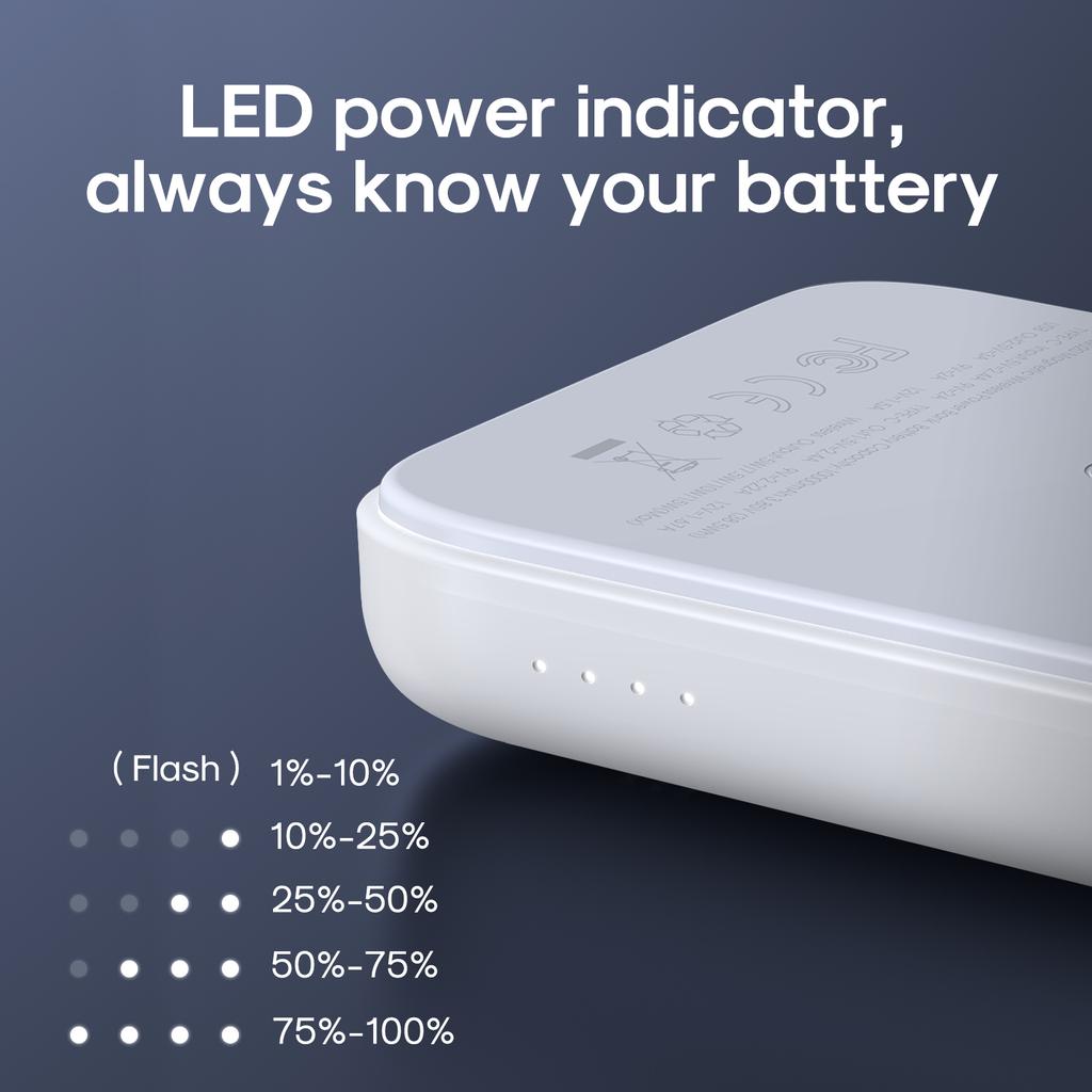 Powerbanken støtter trådløs hurtiglading opptil 15W og har også USB-C- og USB-A-porter for fleksibel lading av flere enheter. Den høye kapasiteten på 10 000 mAh gir flere ladinger for mobiltelefoner og andre USB-enheter.