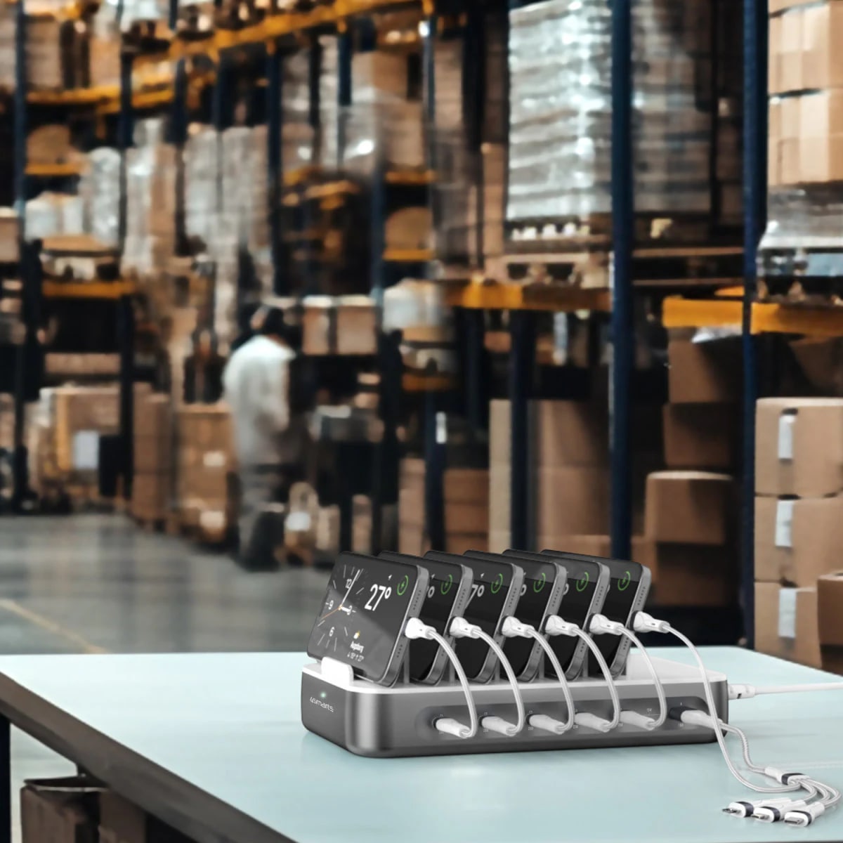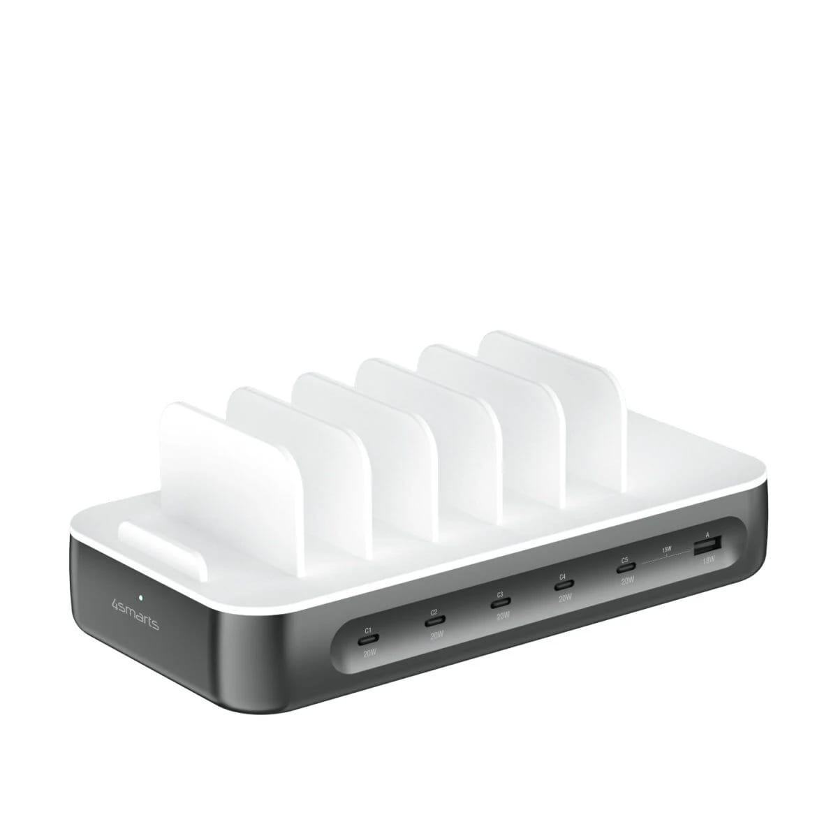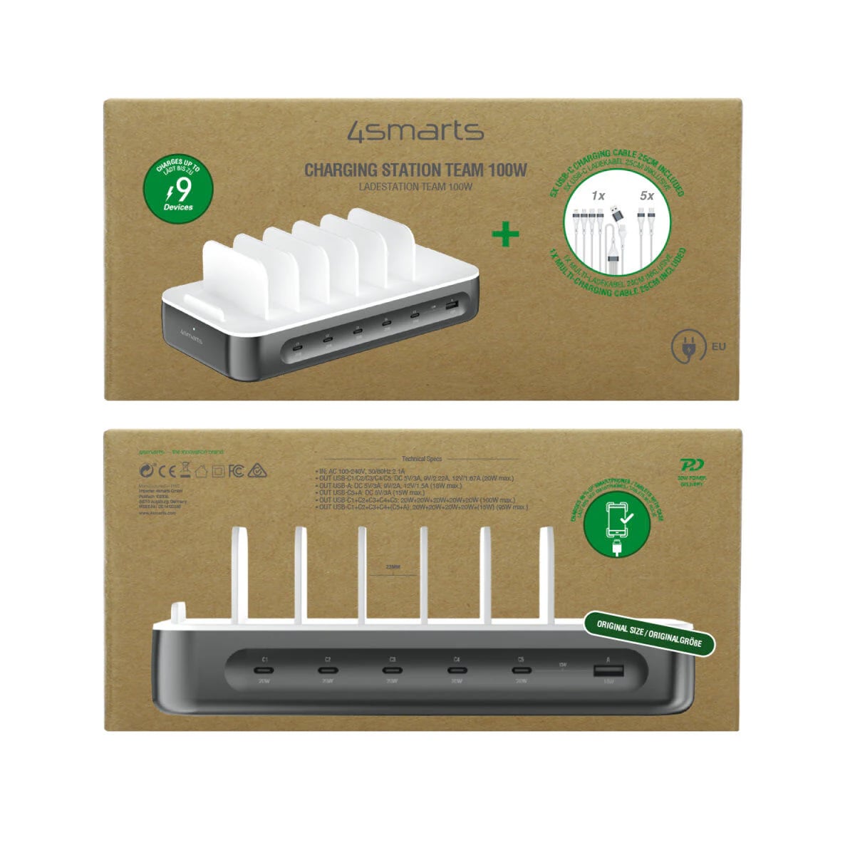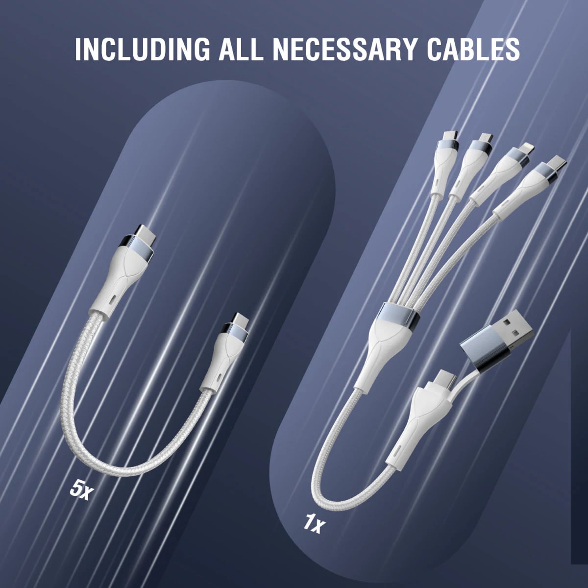 Med denne kraftige USB-ladestation kan du oplade op til ni enheder samtidigt på en nem og overskuelig måde. Ladestationen er udstyret med fem USB-C-porte og én USB-A-port og leveres med flere kabler, hvilket gør den til en komplet løsning til smartphones, tablets, høretelefoner, smartwatches og andre USB-enheder. En samlet udgangseffekt på op til 100 W sikrer hurtig og effektiv opladning, selv når mange enheder er tilsluttet.