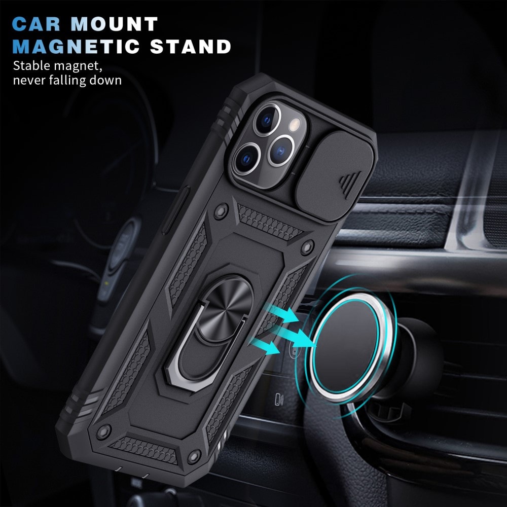 Mobildeksel med uttrekkbar ring til Apple iPhone 11 Pro. For best mulig beskyttelse mot støt og fall er dekselet tredelt, med en TPU-kjerne, et ytre skall i hardplast og en beskyttende ramme rundt skjermen. En kameraluke på baksiden holder linsene trygge når kameraet ikke er i bruk. Ringen kan felles ut for bedre grep eller brukes som stativ når du vil se på film, klipp eller spille.