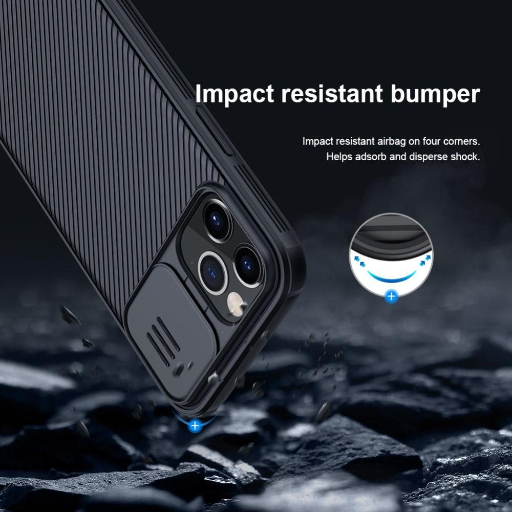Beskyttende deksel med kameralokk og elegant design for Apple iPhone 12 Pro Max fra Nillkin. Dette dekselet beskytter kameraet ditt mot riper og skader med et praktisk skyvelokk som enkelt trekkes foran kameraet når det ikke er i bruk.