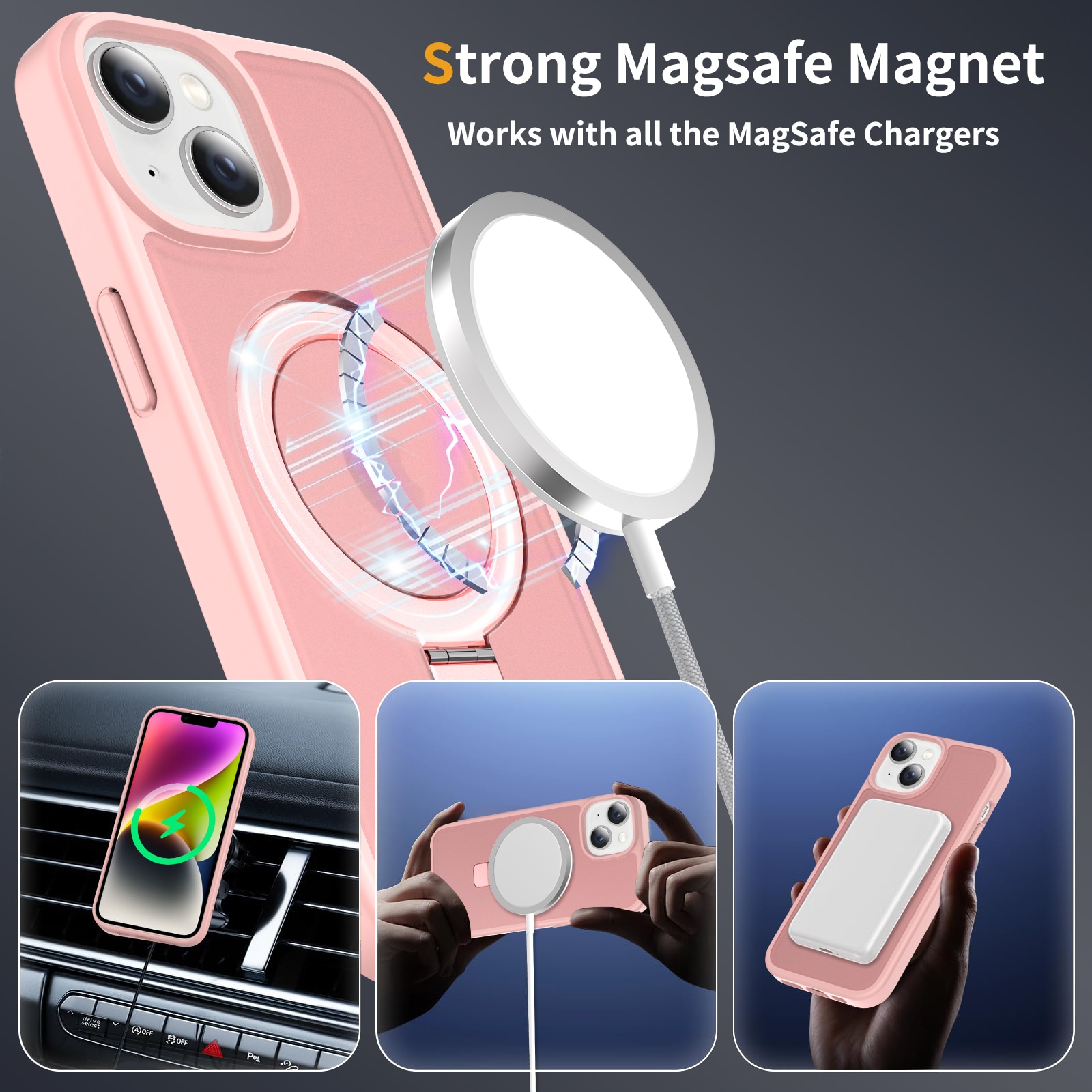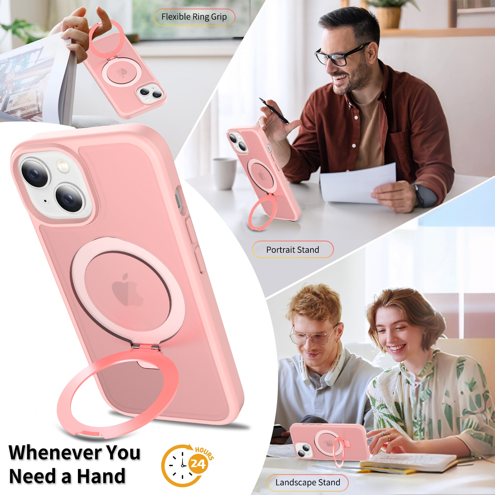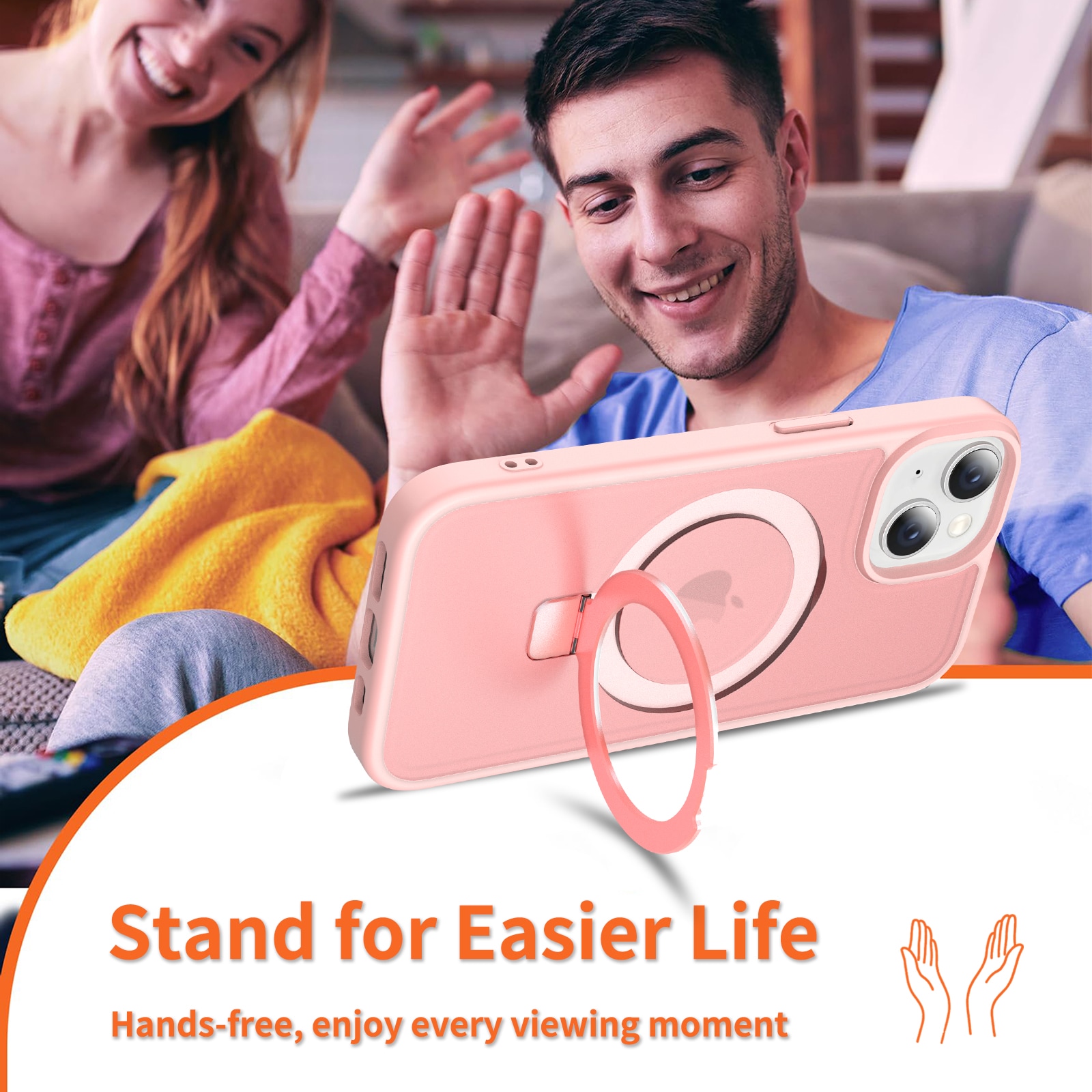 Mobildeksel med utfellbar MagSafe-ring for Apple iPhone 13. For å gi den beste beskyttelsen mot støt og fall, er dekselet todelt med en TPU-kjerne og et ytterlag i hard plast. Ringen på baksiden kan brettes ut for å gi et godt grep på telefonen. Ringen kan også danne et stativ for å se filmer, klipp eller spill.