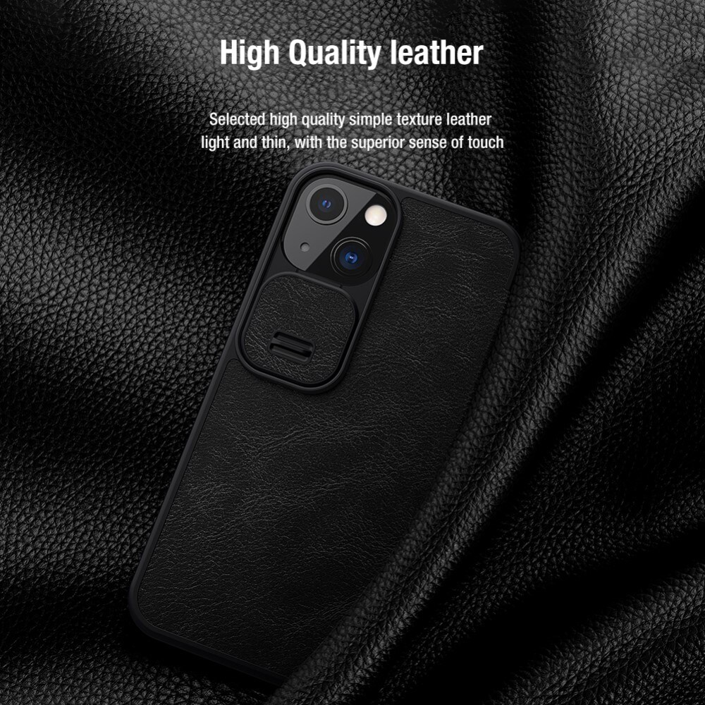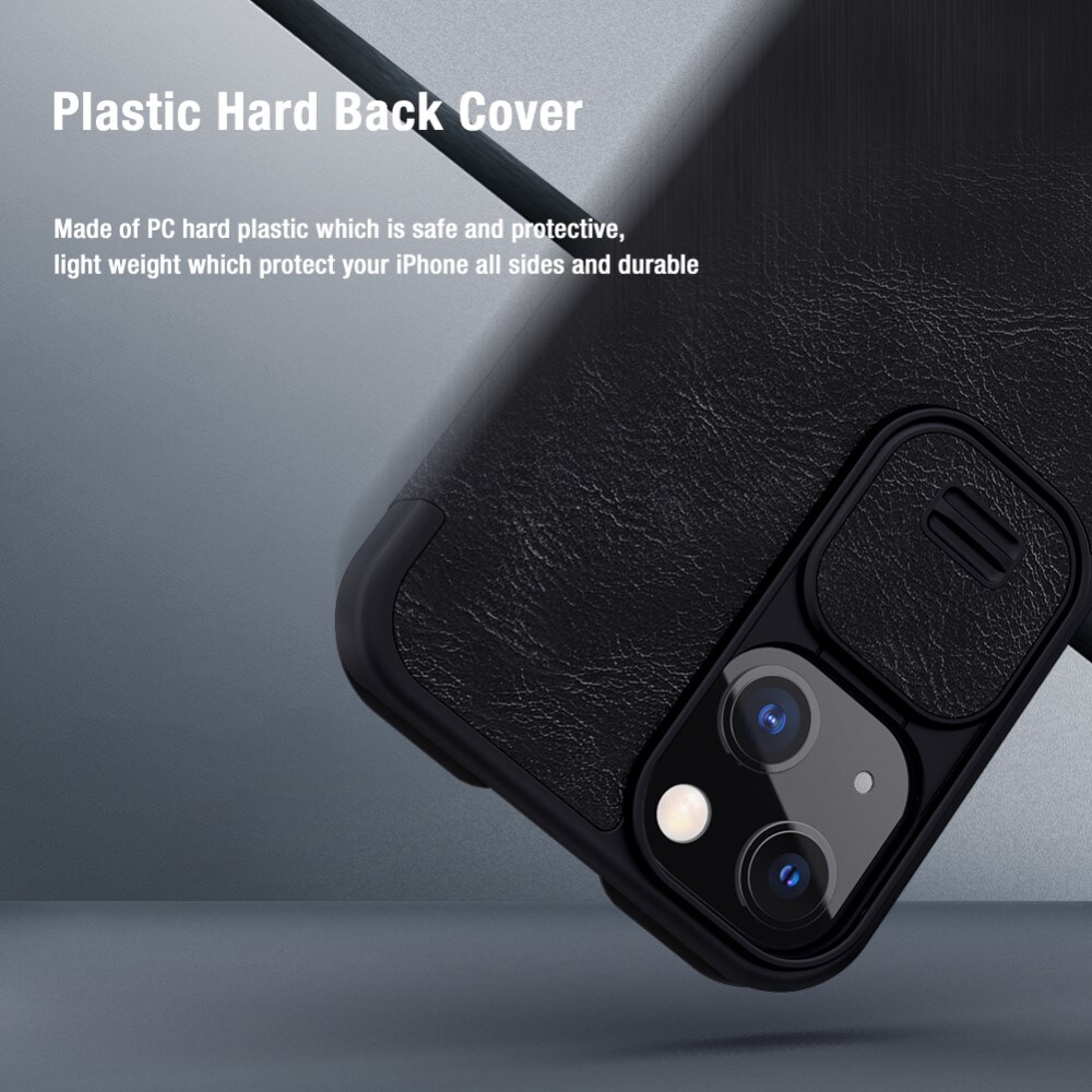 Tynt og lett Nillkin etui med smart kamerabeskyttelse til Apple iPhone 13. Etuiet er fra Nillkins Qin Series - en rekke mobiletuier som er veldig tynne og lette samtidig som de beskytter hele telefonen.