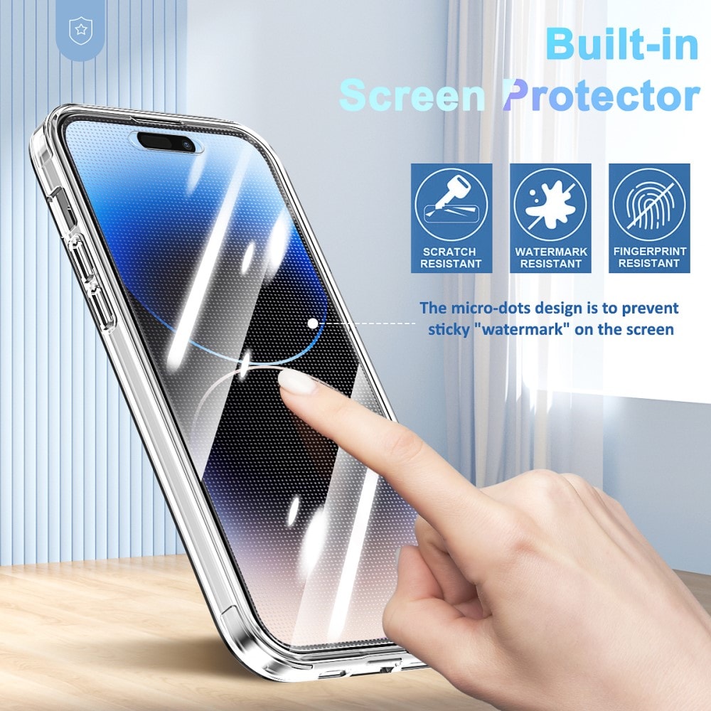 Beskytt din Apple iPhone 14 Pro med dette heldekkende dekselet. Dekselet har en todelt konstruksjon, der det fremre laget har innebygd skjermbeskyttelse for å beskytte hele telefonen. Unngå skader på telefonen og skjermen.