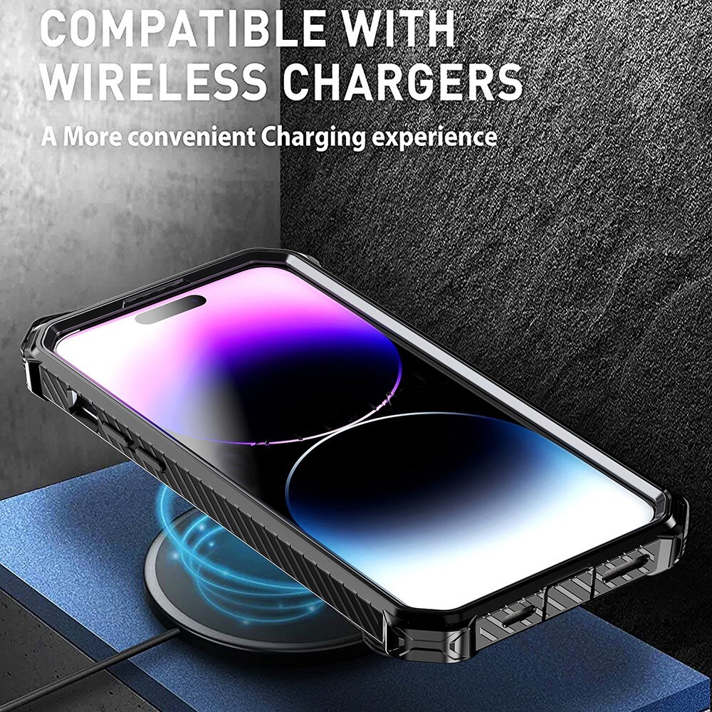 Mobildeksel med utfellbar MagSafe-ring for iPhone 14 Pro. For å gi den beste beskyttelsen mot støt og fall, er dekselet todelt med en TPU-kjerne og et ytterlag i hard plast. Ringen på baksiden kan brettes ut for å gi et godt grep på telefonen. Ringen kan også danne et stativ for å se filmer, klipp eller spill.