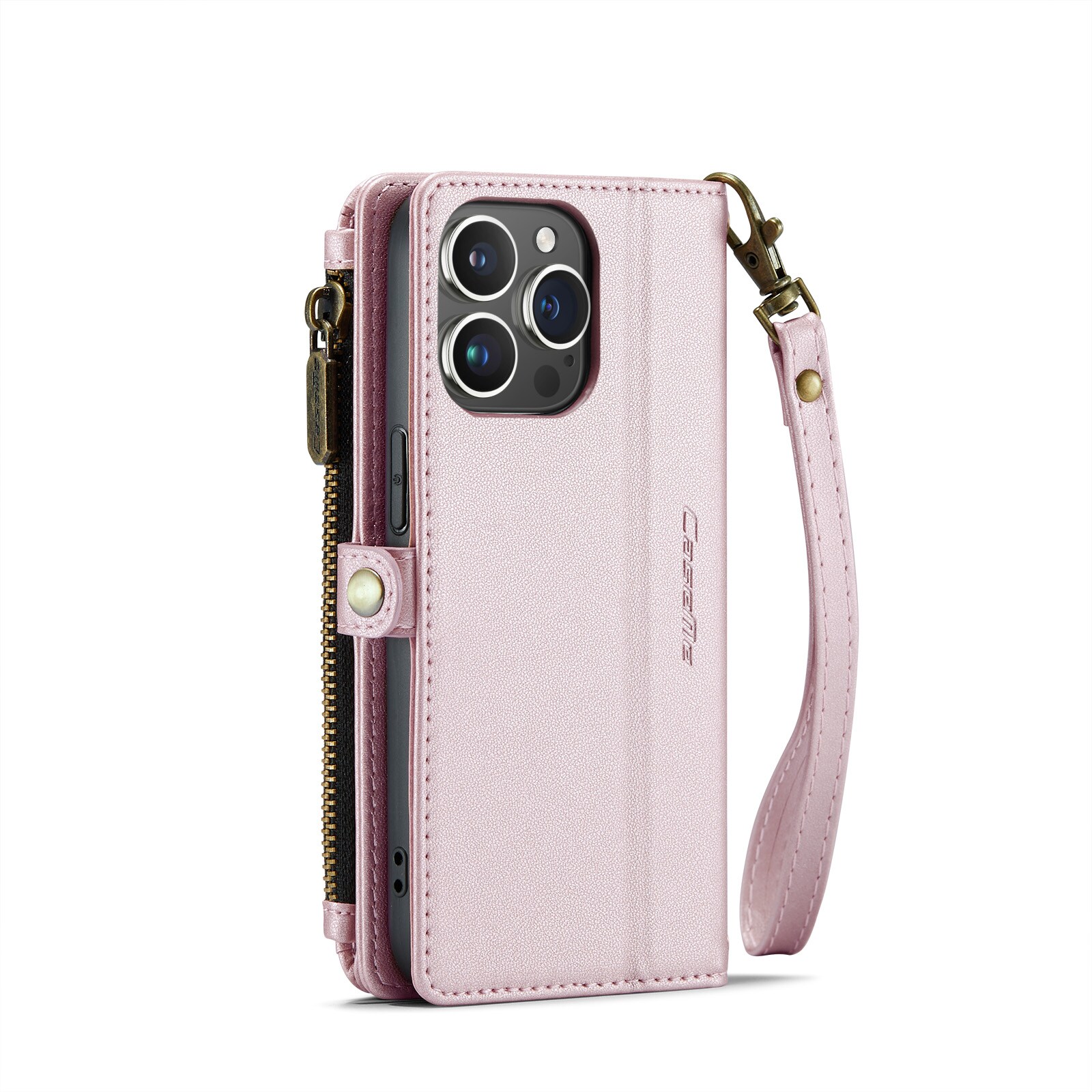 Eit stilig og praktisk mobil-etui med innebygd lommebok og mange kortspor for iPhone 14 Pro fra CaseMe. Den romslege lommeboka har ei lomme på utsida, seddelomme, myntomme med glidelås og fleire kortspor. Etuiet kan også brukast som eit stativ, noko som gjer det enkelt å nyte handsfree-visning av telefonen.