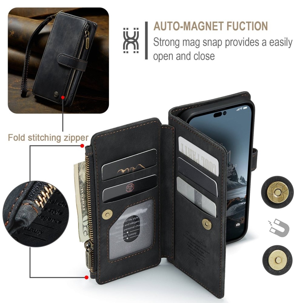 Mobiletui med ekstra romslig lommebok og mange kortlommer til Apple iPhone 14 Pro fra CaseMe. Lommeboken har 7 kortlommer, en seddellomme og et romslig myntrom med glidelås.