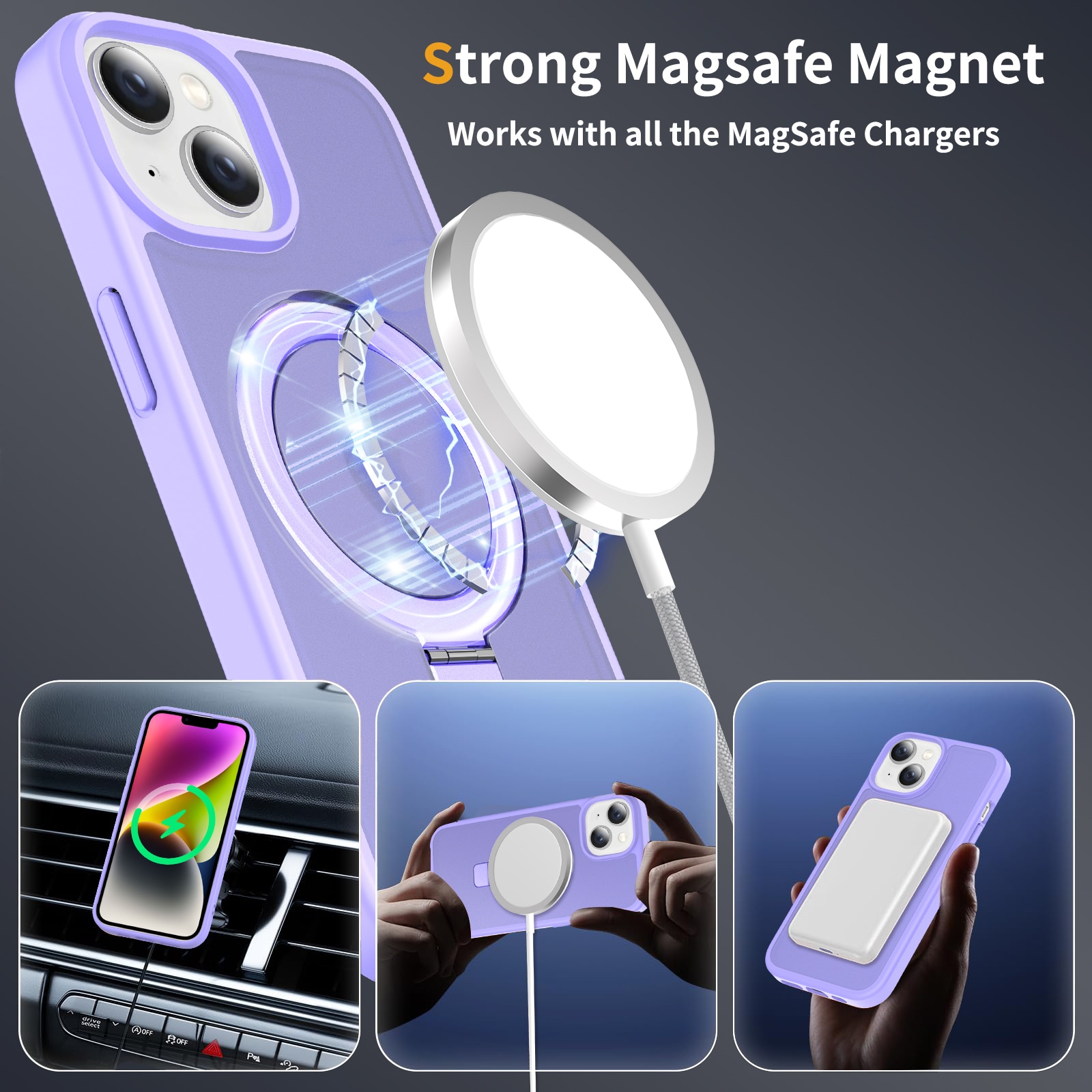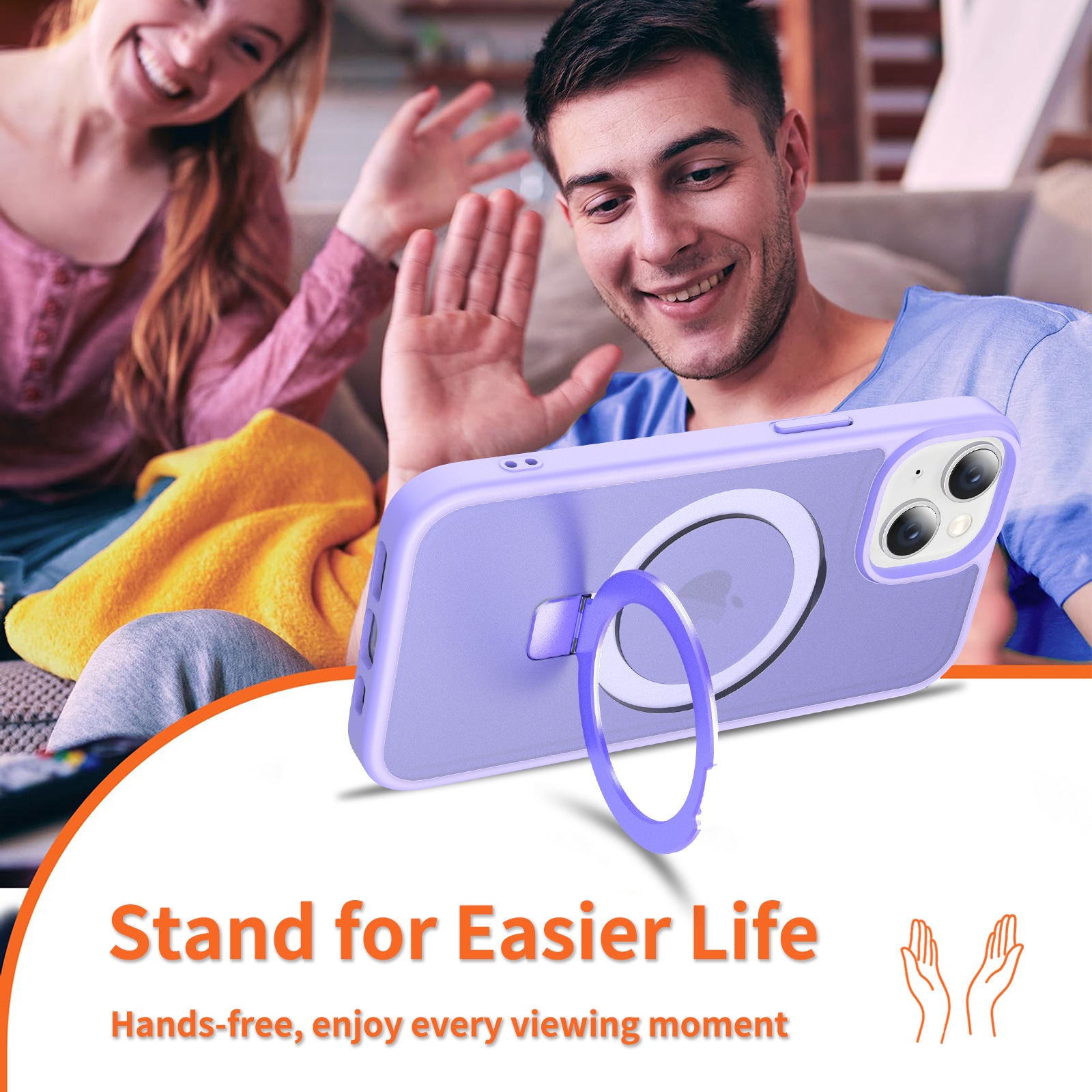 Mobildeksel med utfellbar MagSafe-ring for Apple iPhone 14. For å gi den beste beskyttelsen mot støt og fall, er dekselet todelt med en TPU-kjerne og et ytterlag i hard plast. Ringen på baksiden kan brettes ut for å gi et godt grep på telefonen. Ringen kan også danne et stativ for å se filmer, klipp eller spill.