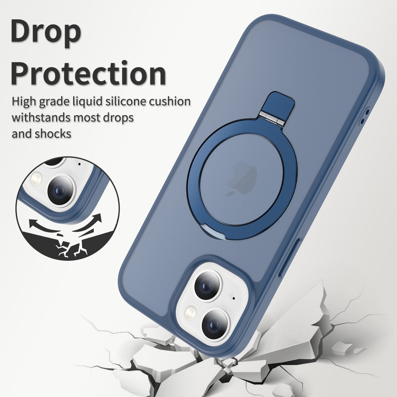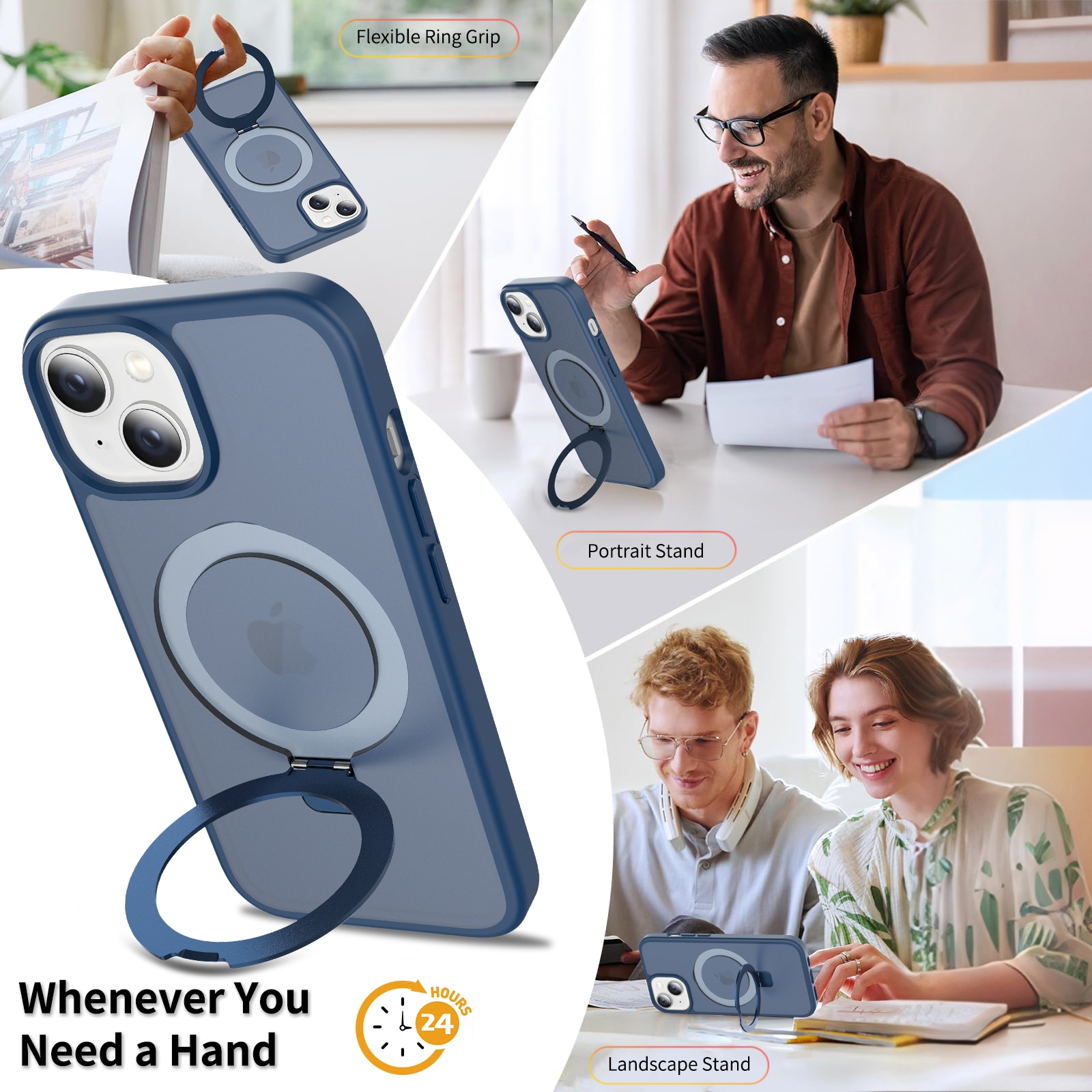 Mobildeksel med utfellbar MagSafe-ring for Apple iPhone 15. For å gi den beste beskyttelsen mot støt og fall, er dekselet todelt med en TPU-kjerne og et ytterlag i hard plast. Ringen på baksiden kan brettes ut for å gi et godt grep på telefonen. Ringen kan også danne et stativ for å se filmer, klipp eller spill.