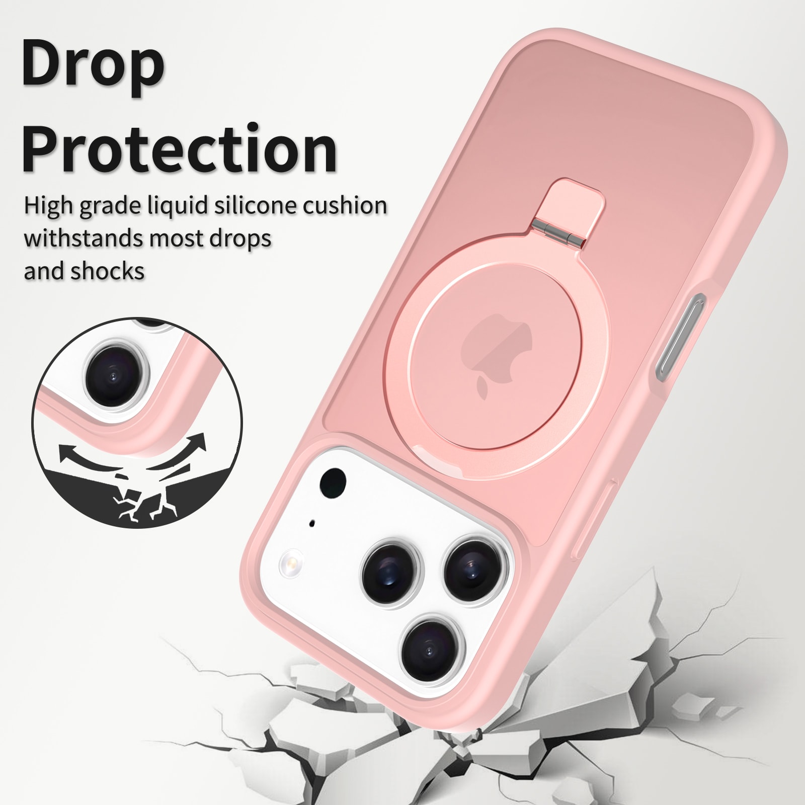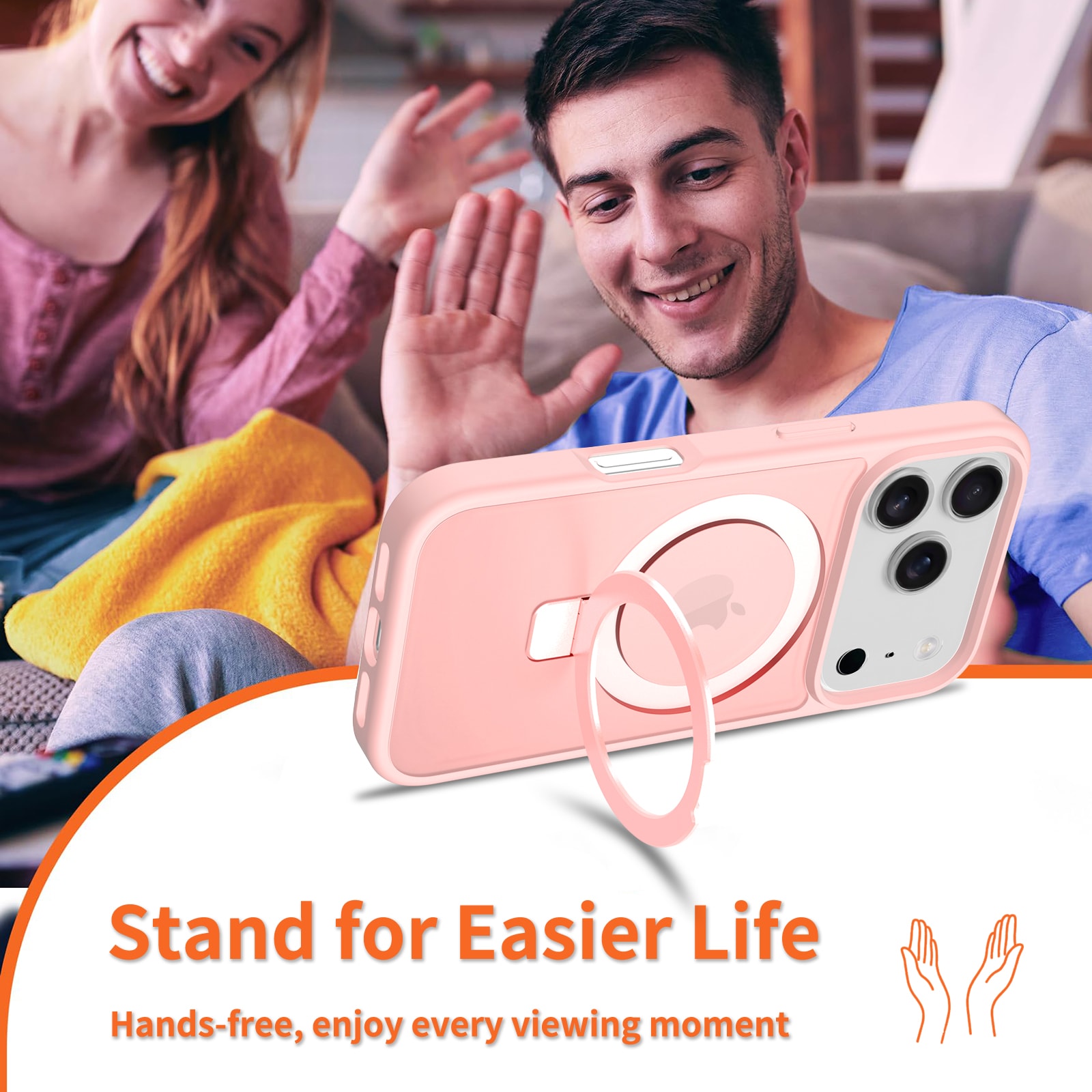 Mobildeksel med utfellbar MagSafe-ring for Apple iPhone 17 Pro. For å gi den beste beskyttelsen mot støt og fall, er dekselet todelt med en TPU-kjerne og et ytterlag i hard plast. Ringen på baksiden kan brettes ut for å gi et godt grep på telefonen. Ringen kan også danne et stativ for å se filmer, klipp eller spill.