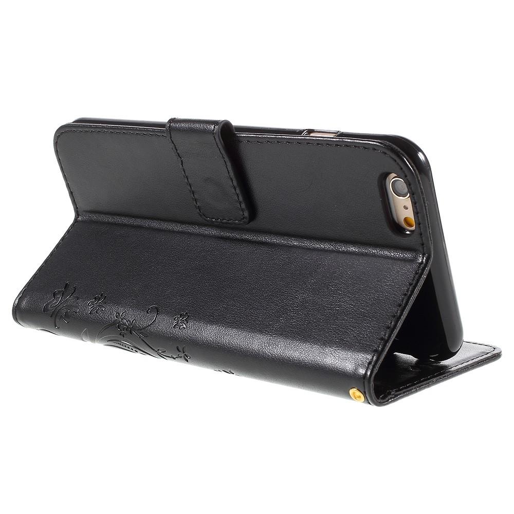Mobilveske med pregede sommerfugler og mønstre i læret til Apple iPhone 6/6S. Vesken har et fint utseende og beskytter hele telefonen slik at du unngår skader, riper og smuss.