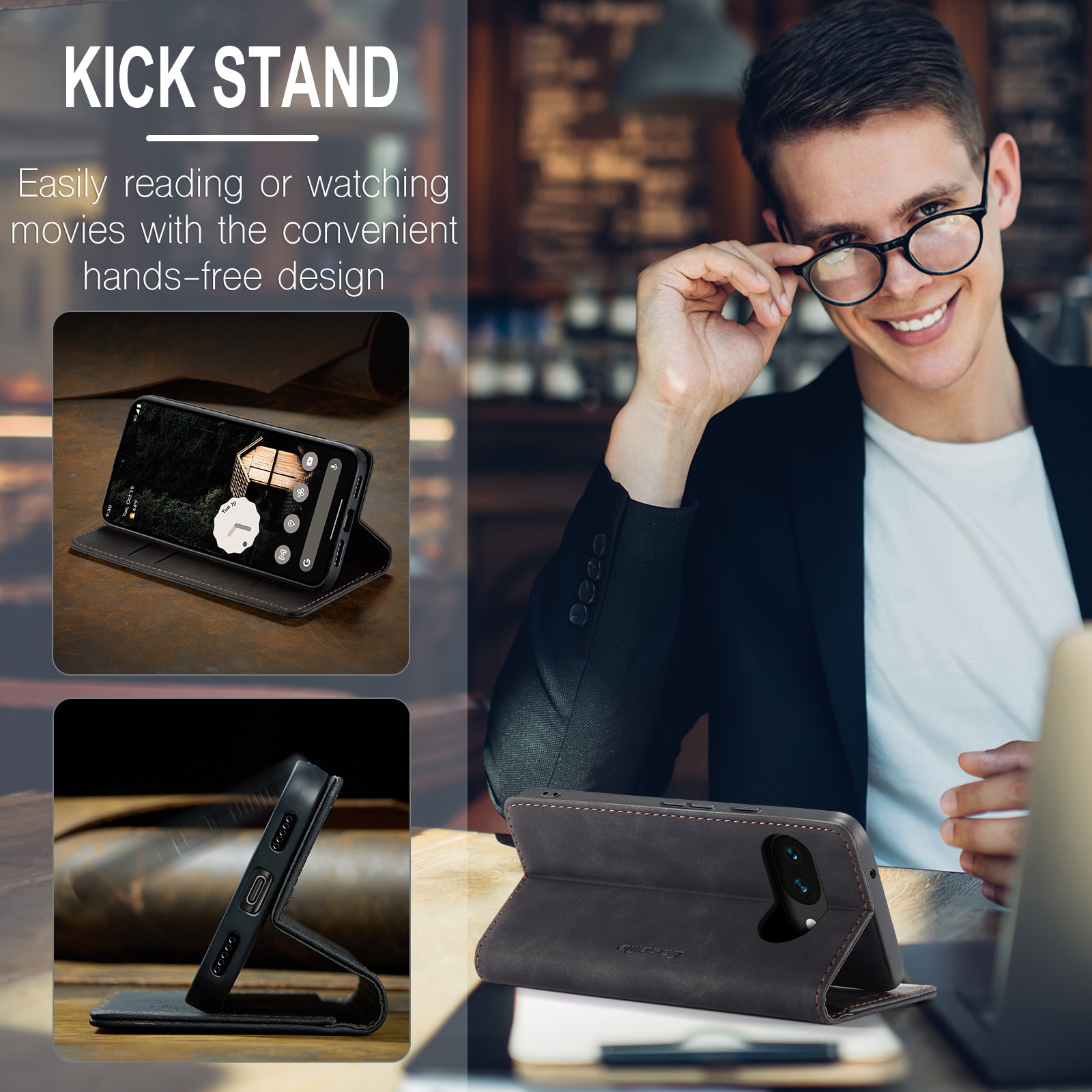 Lommeboken på innsiden av lokket har plass til kort, og det finnes en lomme for sedler eller kvitteringer. Ønsker du å se på film eller serier, kan du enkelt brette etuiet til et praktisk mobilstativ.
