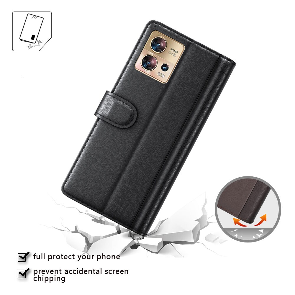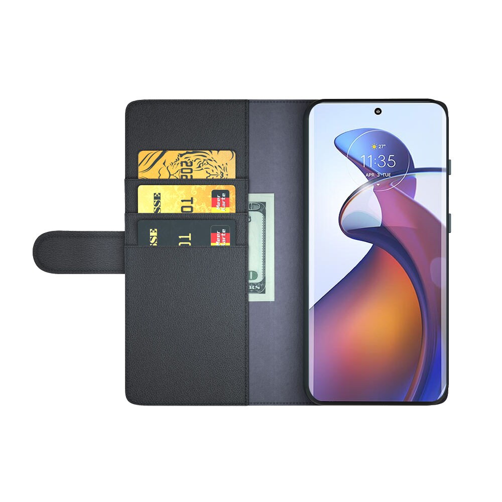 Mobilt lærveske i ekte lær til Motorola Edge 30 Fusion. Vesken beskytter hele telefonen og har en romslig lommebok på innsiden av dekselet. Lommeboken har tre kortlommer og en seddellomme.