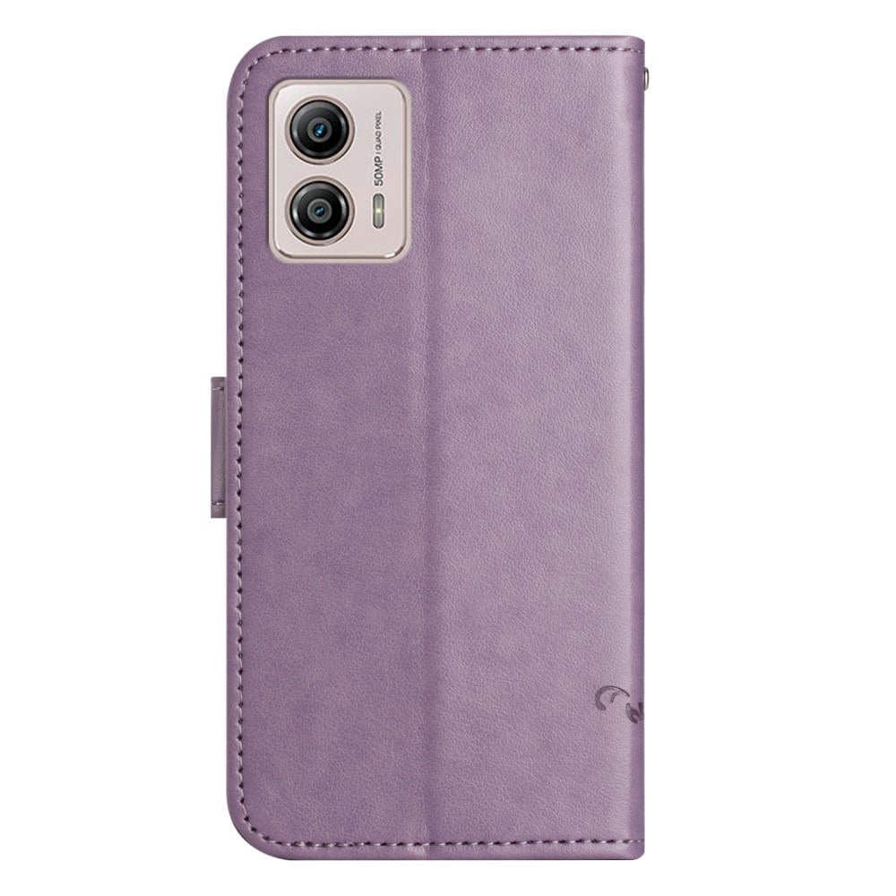Mobilveske med pregede sommerfugler og mønstre i læret til Motorola Moto G53. Vesken har et fint utseende og beskytter hele telefonen slik at du unngår skader, riper og smuss.