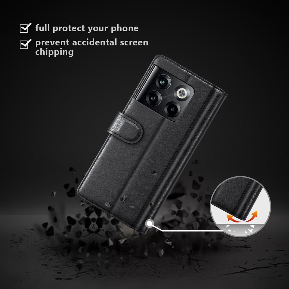 Mobilt lærveske i ekte lær til OnePlus 10T. Vesken beskytter hele telefonen og har en romslig lommebok på innsiden av dekselet. Lommeboken har tre kortlommer og en seddellomme.