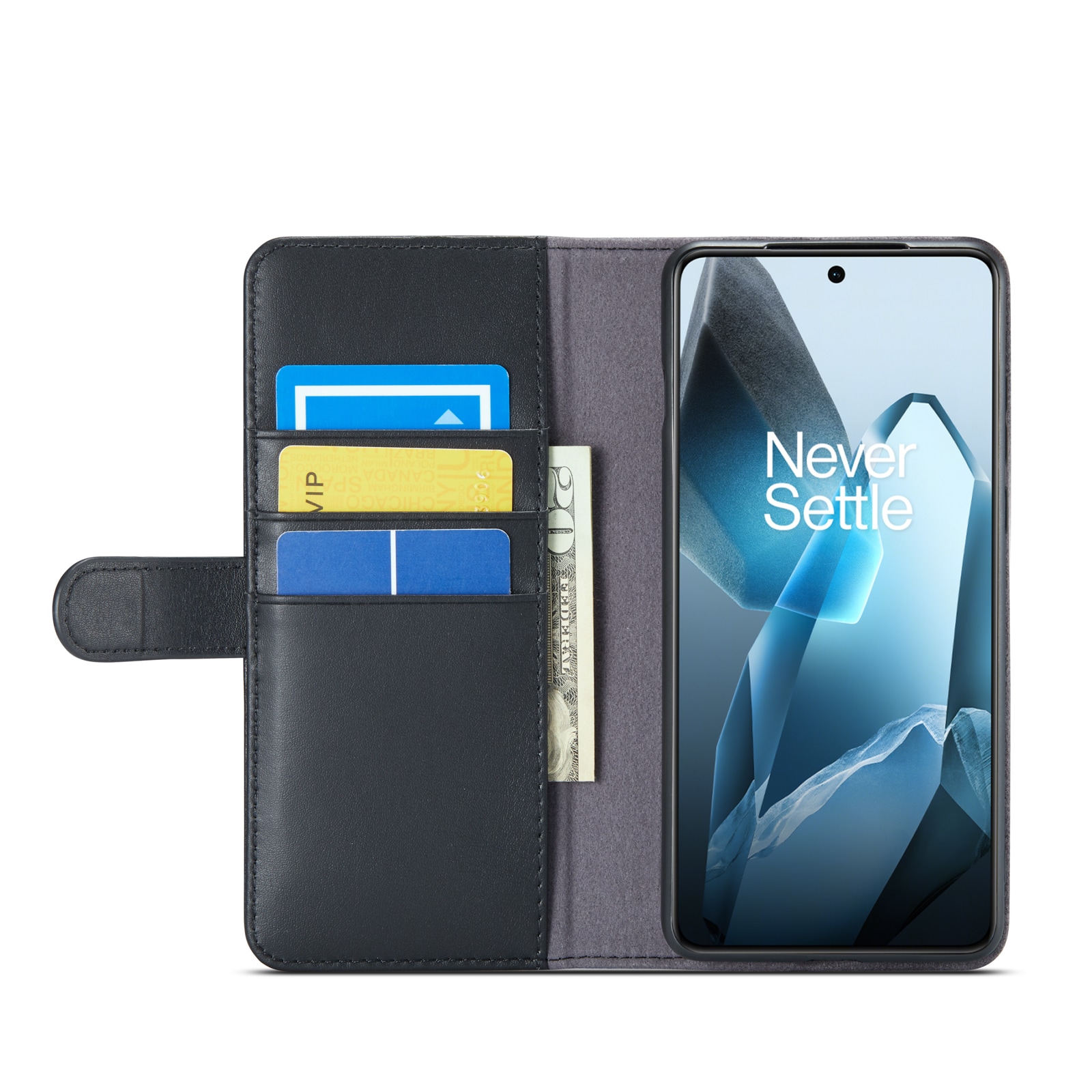 Mobilt lærveske i ekte lær til OnePlus 13. Vesken beskytter hele telefonen og har en romslig lommebok på innsiden av dekselet. Lommeboken har tre kortlommer og en seddellomme.