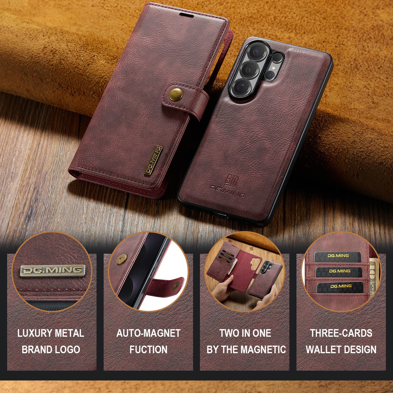 DG.MING etui med avtagbart magnetiskt deksel til Samsung Galaxy S26 Ultra. Vesken har en klassisk og stilig design. Det avtagbare skallet betyr at du ikke trenger å bruke hele etui, for eksempel når du er hjemme eller på jobb.