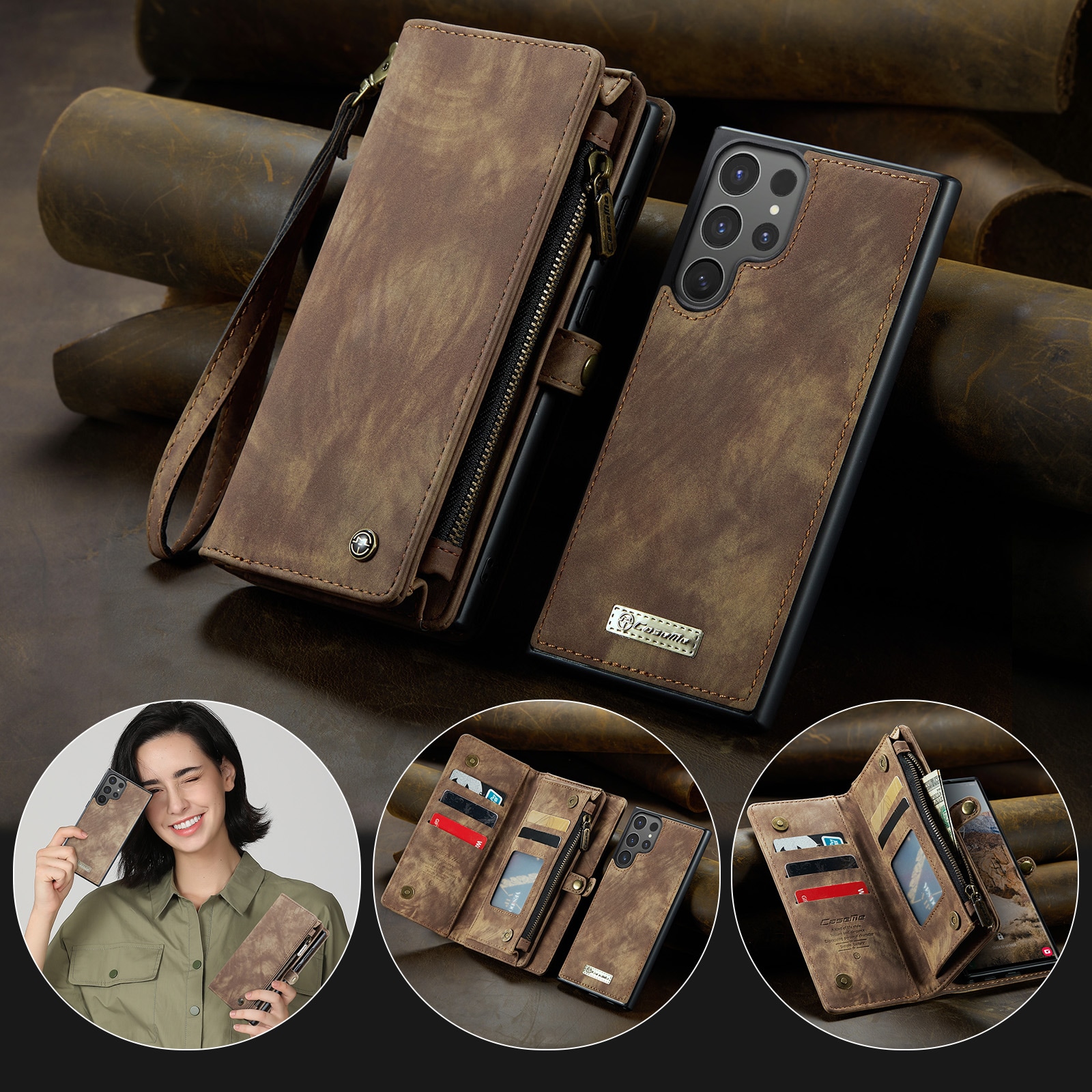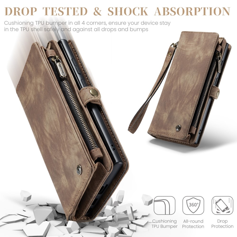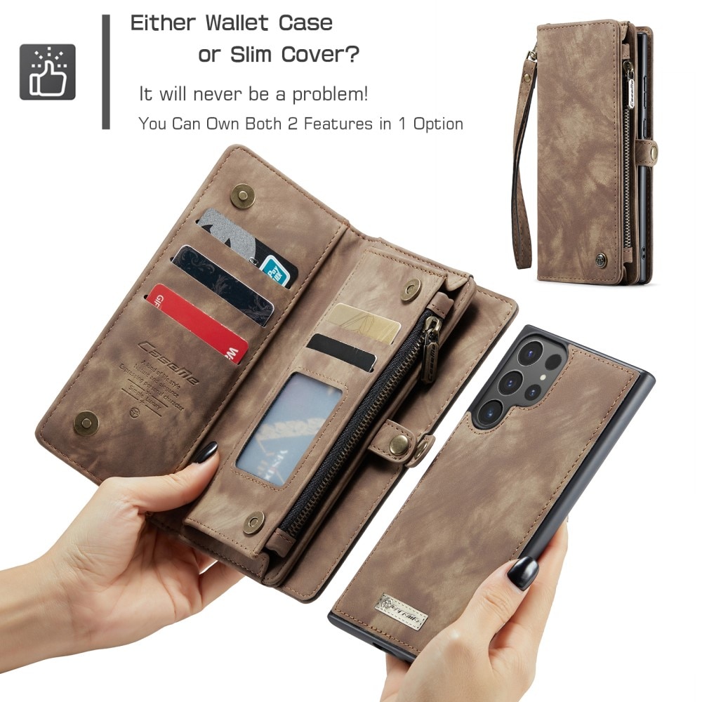 CaseMe mobiletui med magnetisk deksel og ekstra romslig lommebok med mange kortlommer til Samsung Galaxy S26 Ultra. Lommeboken har flere kortlommer, en seddellomme og en myntlomme med glidelås.