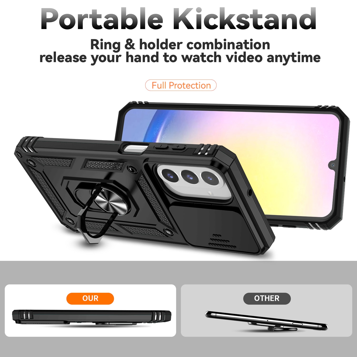 Mobildeksel med uttrekkbar ring til Samsung Galaxy A17. For best mulig beskyttelse mot støt og fall er dekselet tredelt, med en TPU-kjerne, et ytre skall i hardplast og en beskyttende ramme rundt skjermen. En kameraluke på baksiden holder linsene trygge når kameraet ikke er i bruk. Ringen kan felles ut for bedre grep eller brukes som stativ når du vil se på film, klipp eller spille.