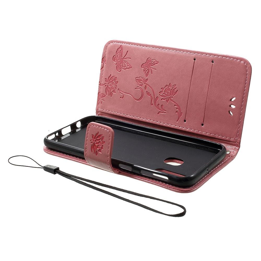 Mobilveske med pregede sommerfugler og mønstre i læret til Samsung Galaxy A40. Vesken har et fint utseende og beskytter hele telefonen slik at du unngår skader, riper og smuss.
