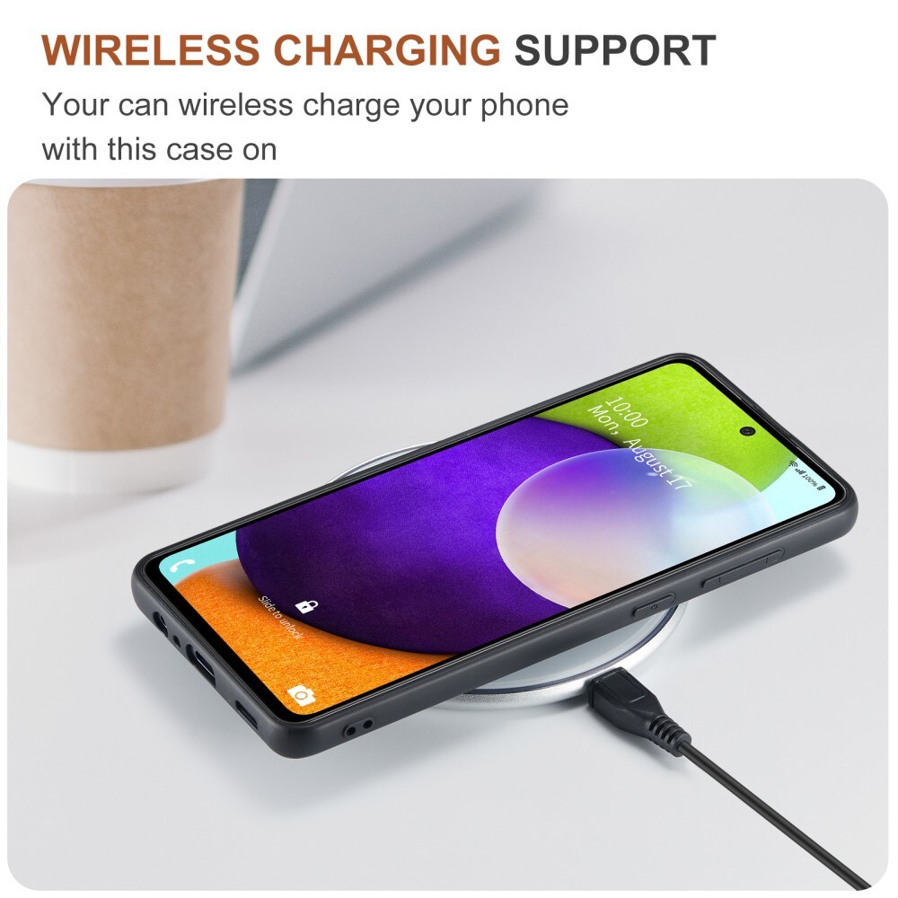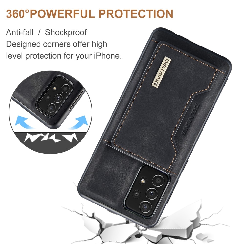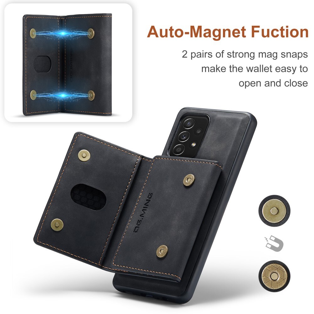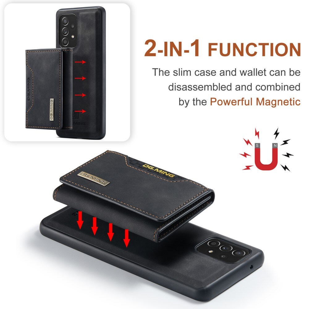 Deksel i kunstlær til Samsung Galaxy A52 5G med tilhørende lommebok. Lommeboken festes med magneter på baksiden av dekselet og kan enkelt tas av når du ikke trenger den. Ved å folde ut lommeboken kan den også brukes som stativ, slik at du enkelt kan se film eller videoer.
