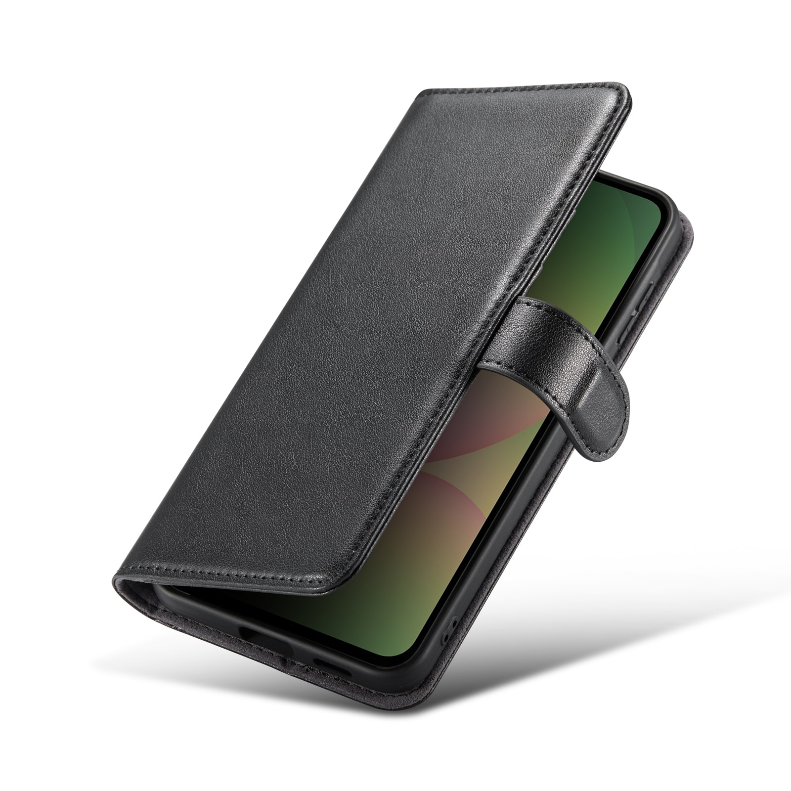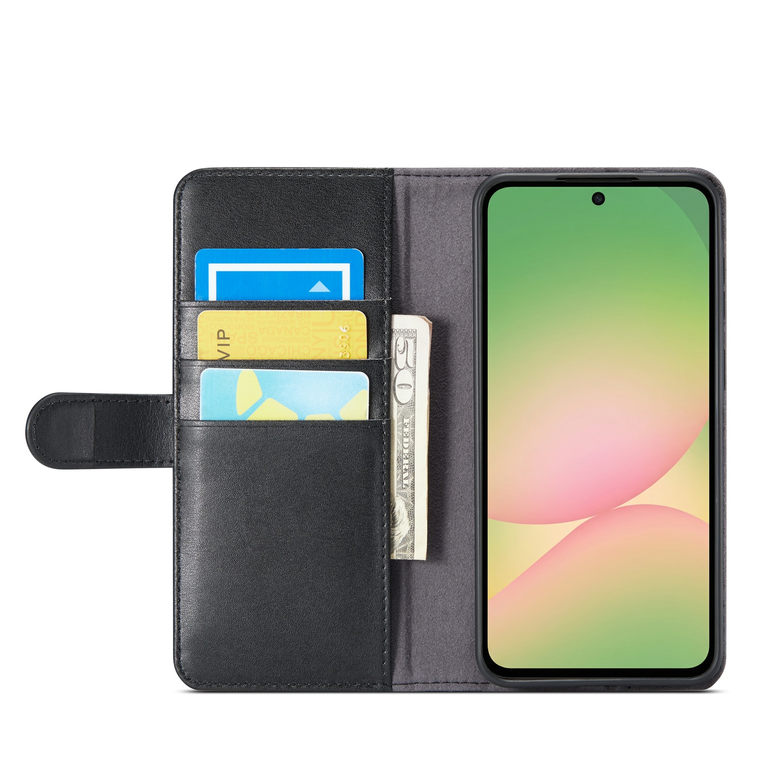Mobilt lærveske i ekte lær til Samsung Galaxy A57. Vesken beskytter hele telefonen og har en romslig lommebok på innsiden av dekselet. Lommeboken har tre kortlommer og en seddellomme.