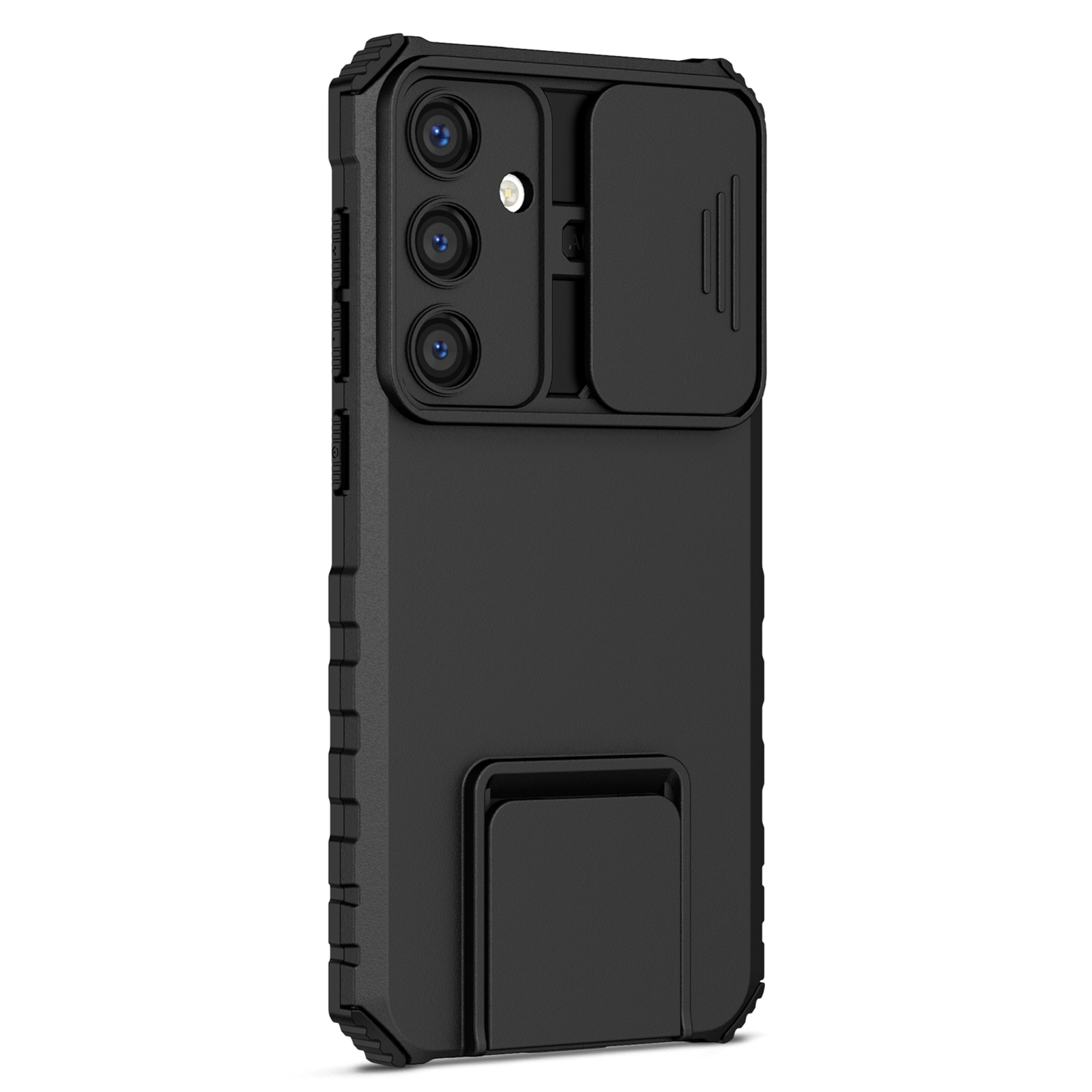 Robust deksel til Samsung Galaxy A57 med innebygd kameralukker og stativ. Dekselet har en tofarget konstruksjon bestående av en ramme i fleksibel TPU og et ytre skall i hardplast. Kantene er forsterket slik at dekselet effektivt demper støt og fall.