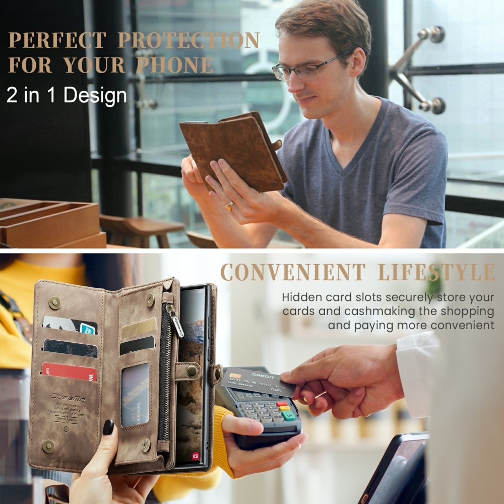 CaseMe mobiletui med magnetisk deksel og ekstra romslig lommebok med mange kortlommer til Samsung Galaxy S24 Ultra. Lommeboken har flere kortlommer, en seddellomme og en myntlomme med glidelås.
