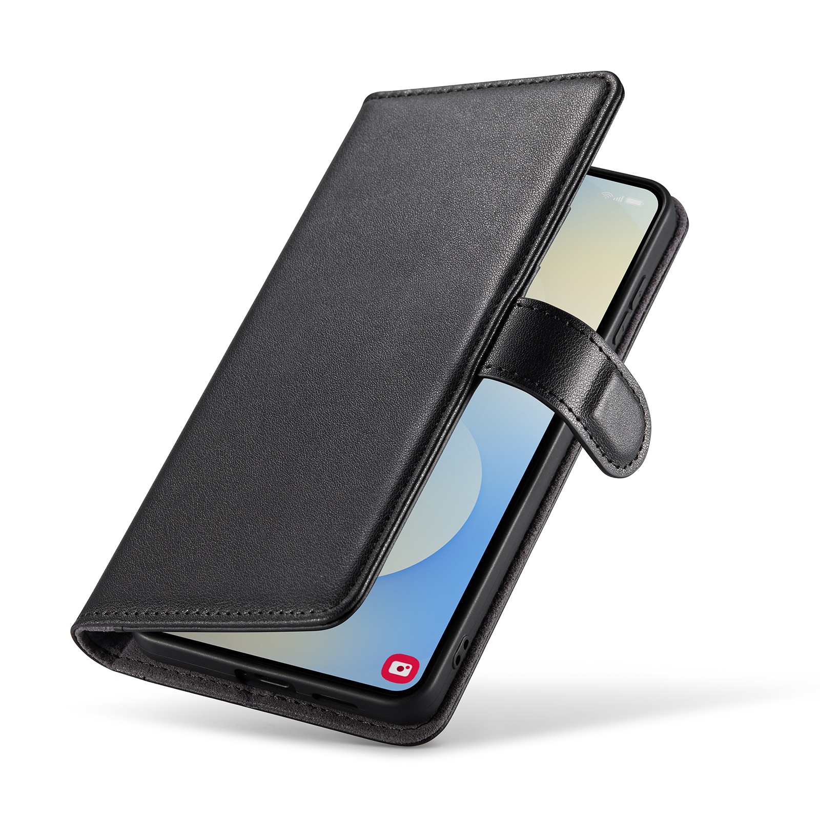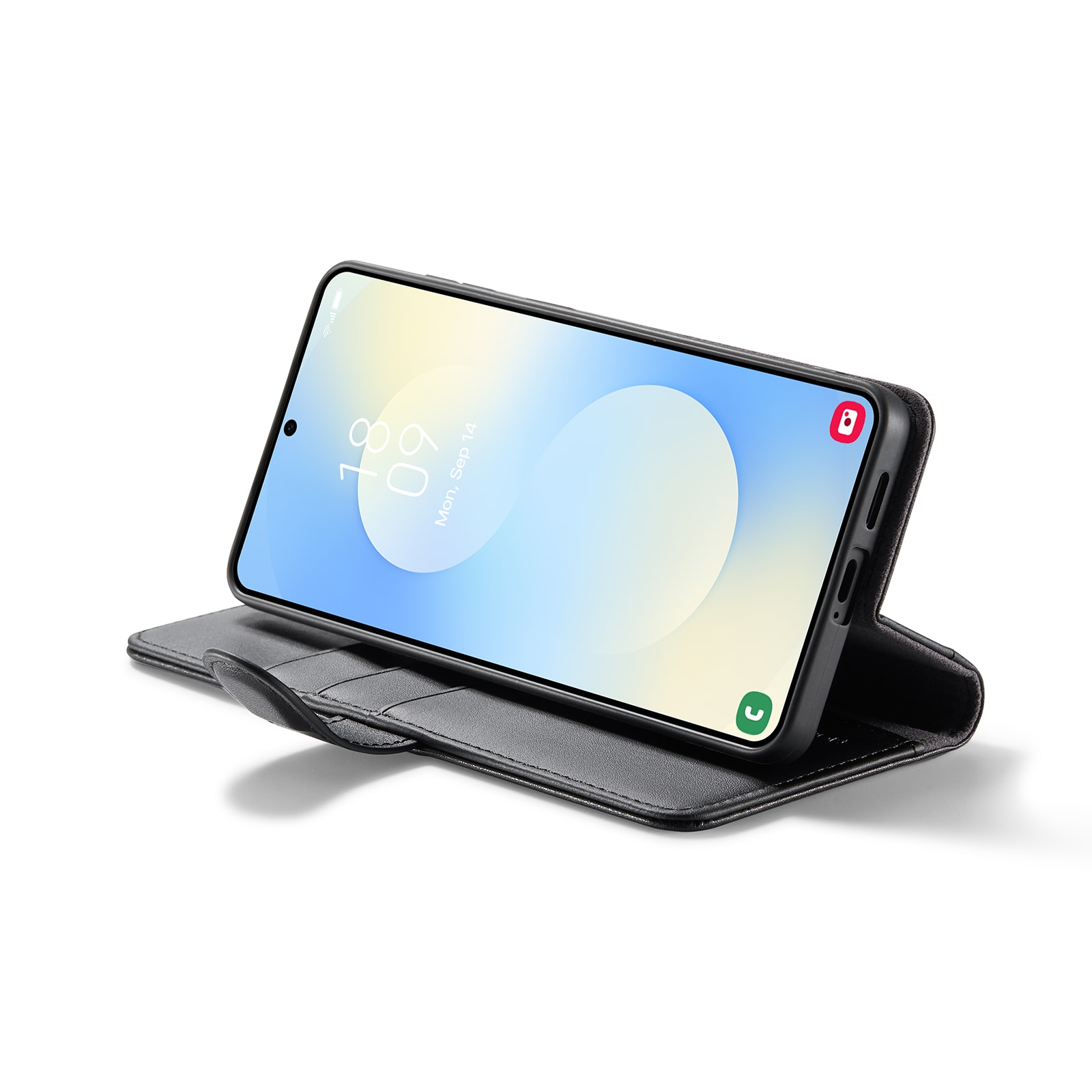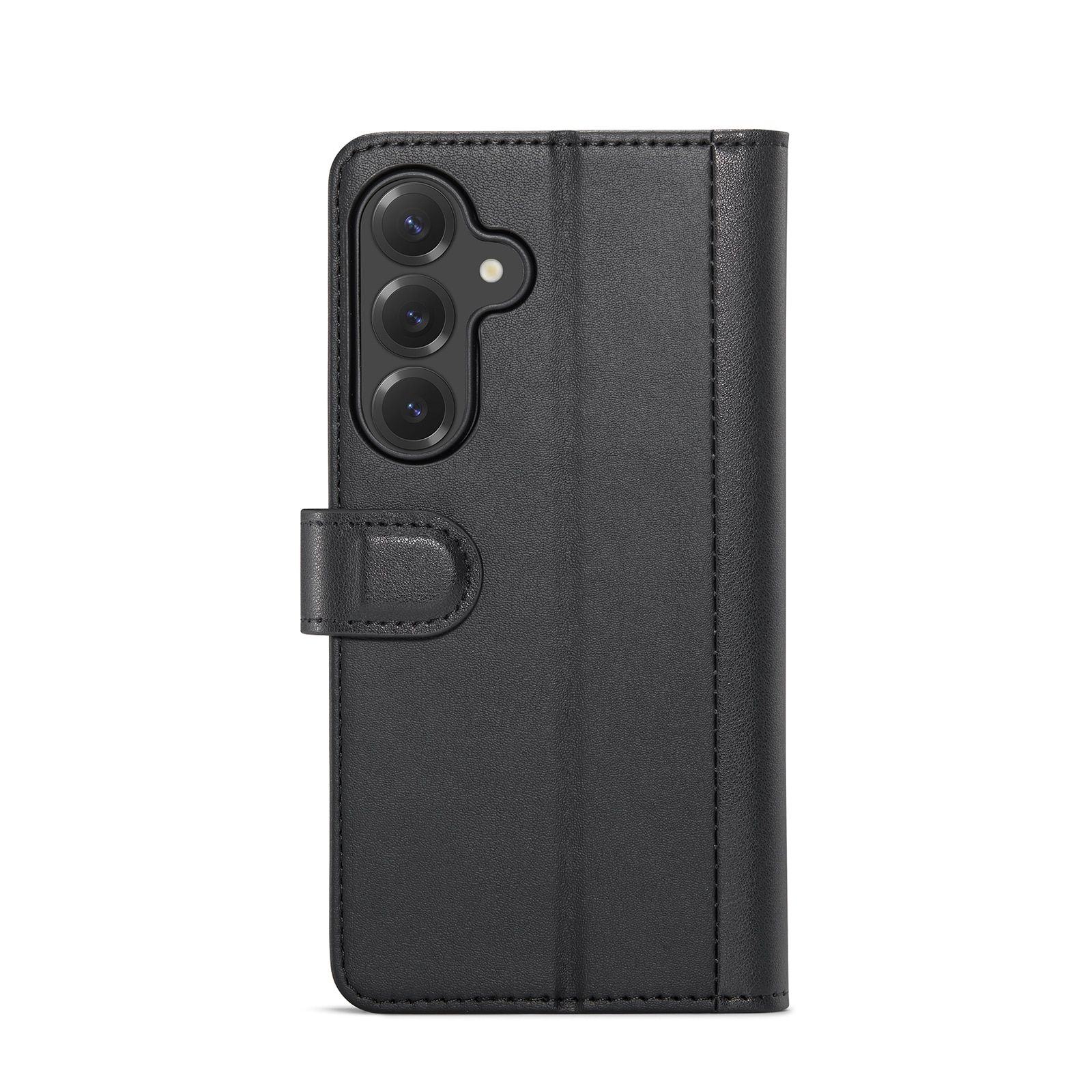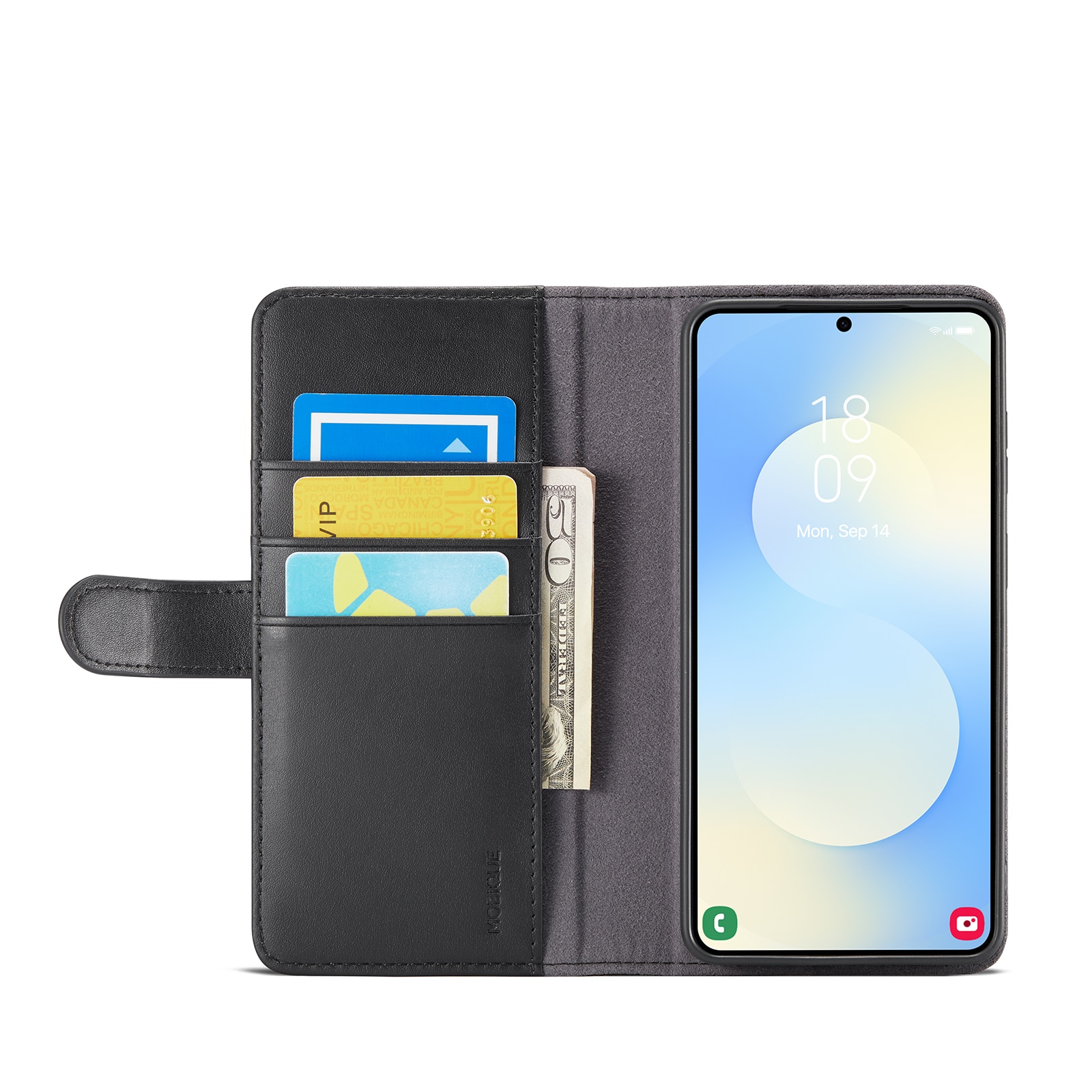 Mobilt lærveske i ekte lær til Samsung Galaxy S26 Plus. Vesken beskytter hele telefonen og har en romslig lommebok på innsiden av dekselet. Lommeboken har tre kortlommer og en seddellomme.