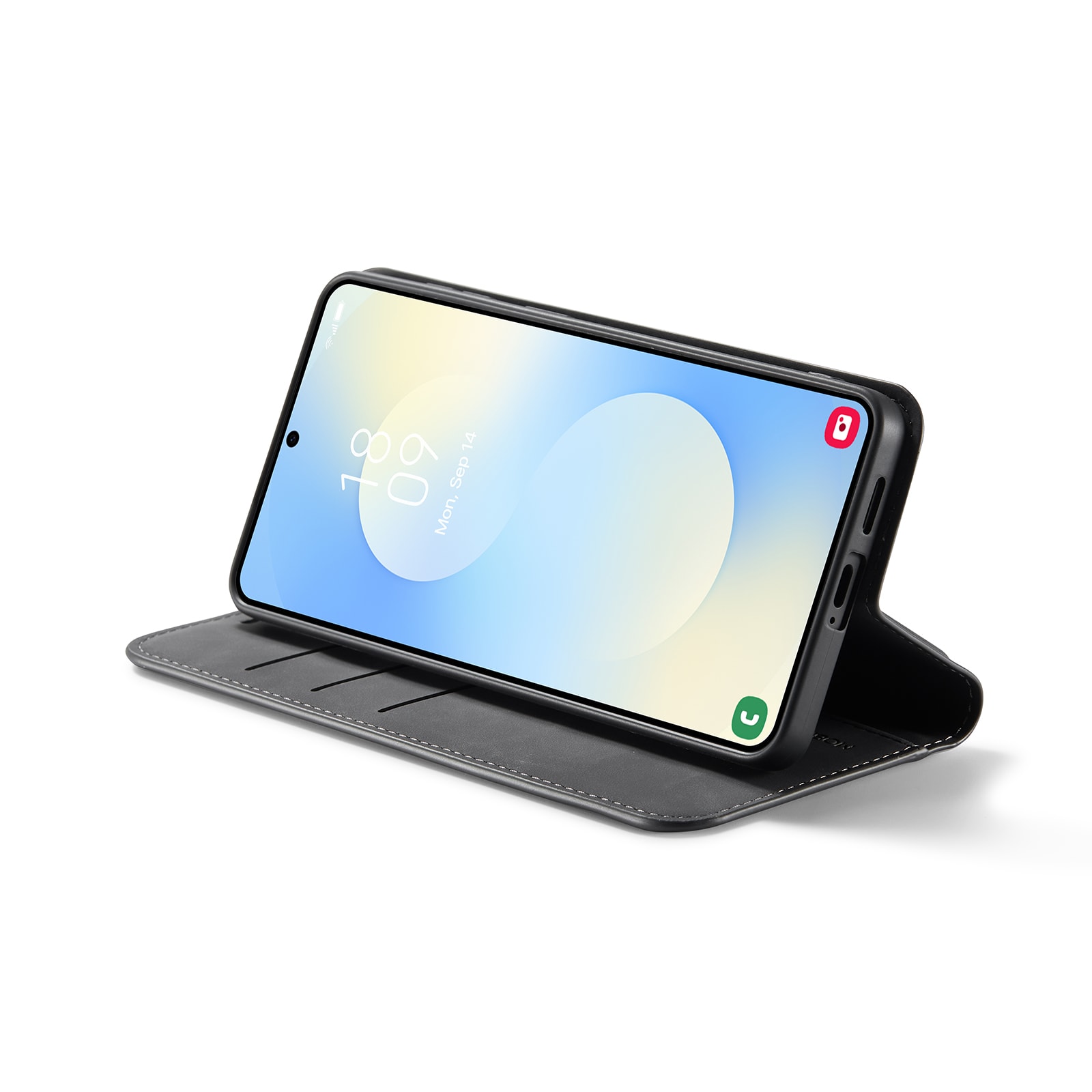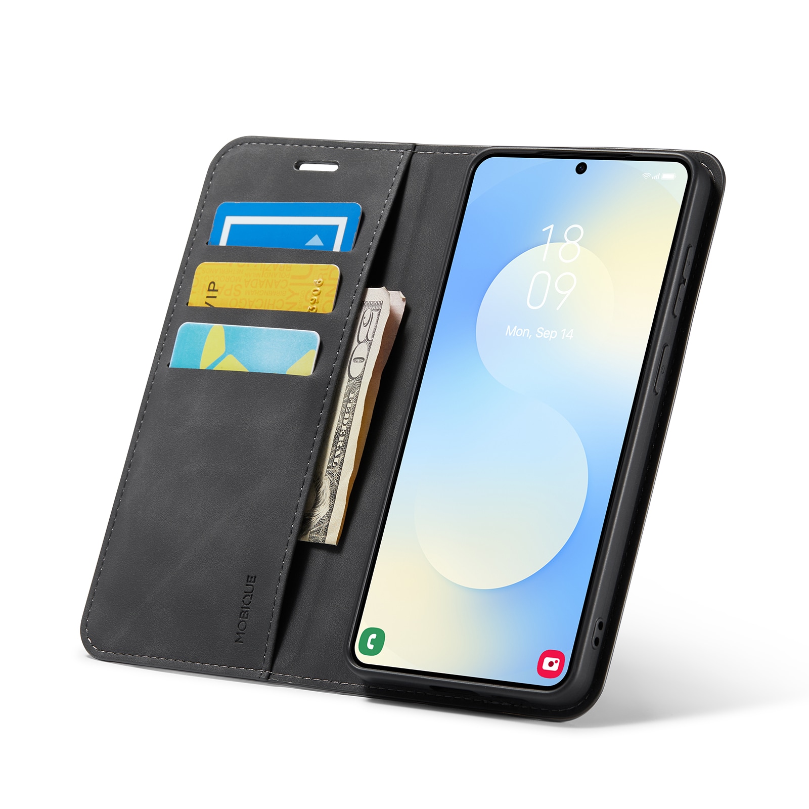 Stilrent og slankt mobilveske til Samsung Galaxy S26 Plus. Etuiet har et silkemykt omslag laget av slitesterkt kunstskinn og et innebygd deksel i støtdempende TPU. Lokket gir god beskyttelse mot riper på skjermen, mens det indre dekselet beskytter godt ved fall og støt.