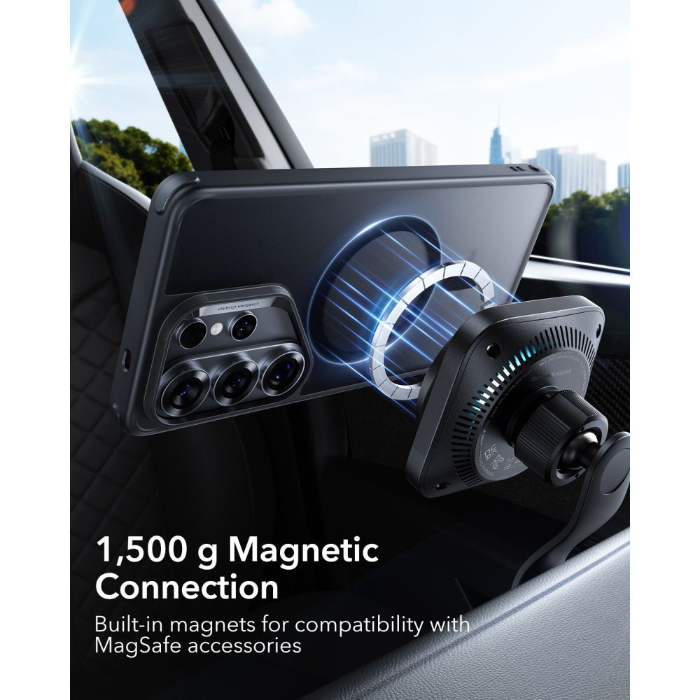 Beskyttende ESR deksel til Samsung Galaxy S26 Ultra. Dekselet er transparent for å fremheve telefonens design samtidig som telefonen er beskyttet. For å gi den beste beskyttelsen mot støt og fall, er dekselet todelt med en TPU-kjerne og et ytterlag i hard plast. Dekselet er MagSafe-kompatibelt med sin innebygde magnetiske ring på baksiden, der du enkelt kan feste din MagSafe-lader eller andre kompatible tilbehør