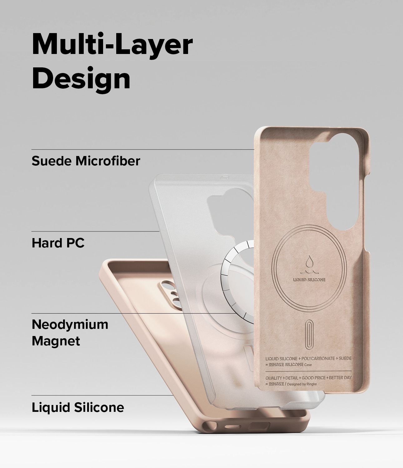 Det er laget i tre lag for best mulig beskyttelse: utside i slitesterk og gripevennlig silikon, en kjerne av hardplast som beskytter mot støt og fall, og innside i mikrofiber som beskytter mot riper.