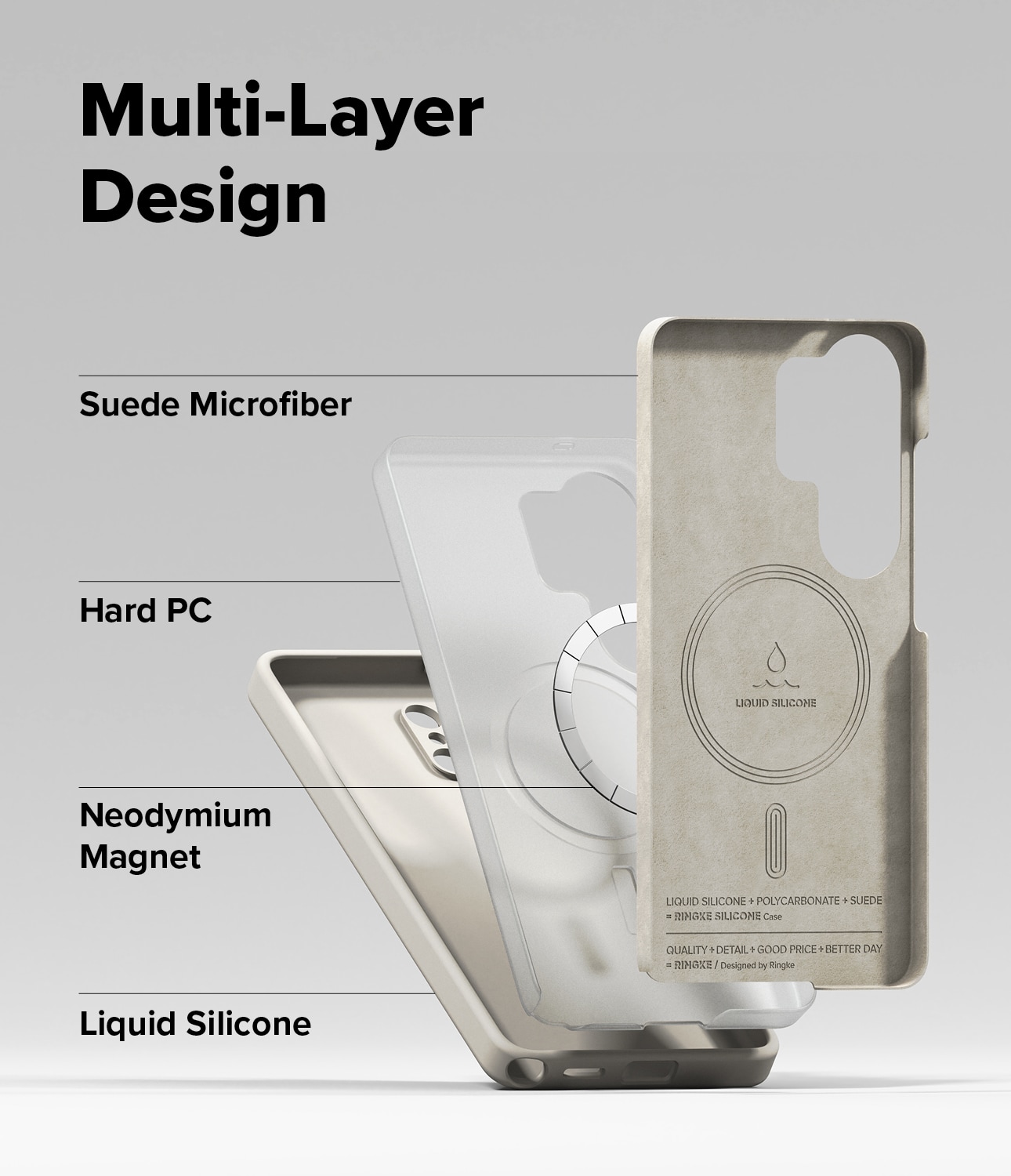 Det er laget i tre lag for best mulig beskyttelse: utside i slitesterk og gripevennlig silikon, en kjerne av hardplast som beskytter mot støt og fall, og innside i mikrofiber som beskytter mot riper.