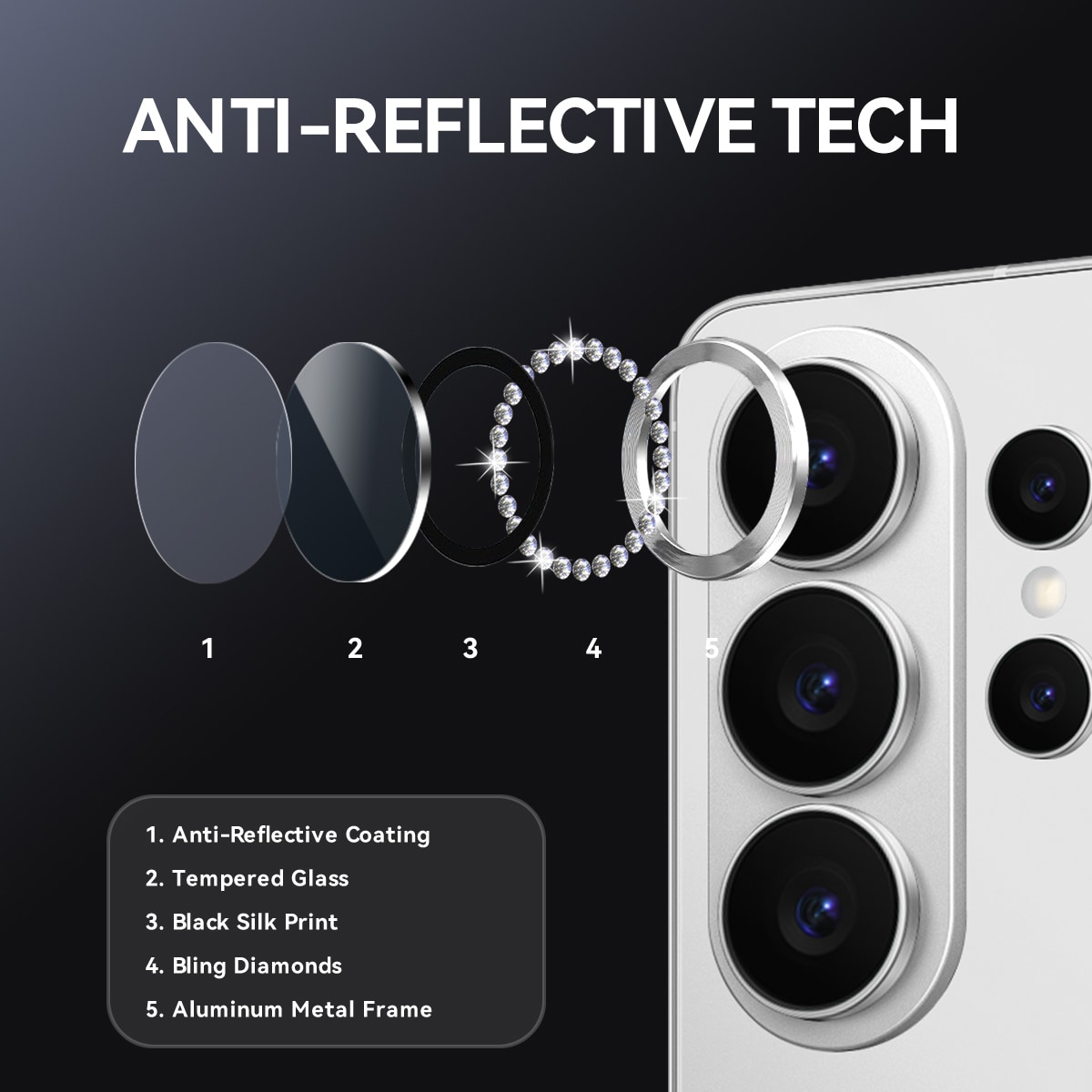 Beskytt kameralinsene på din Samsung Galaxy S26 Ultra med en linsebeskytter i herdet glass med glitrende rhinestones fra Northjo. Den gir pålitelig beskyttelse mot riper og støt, samtidig som kameraet får et elegant og eksklusivt utseende. Den heldekkende designen beskytter hele linsen uten å påvirke bildekvaliteten.