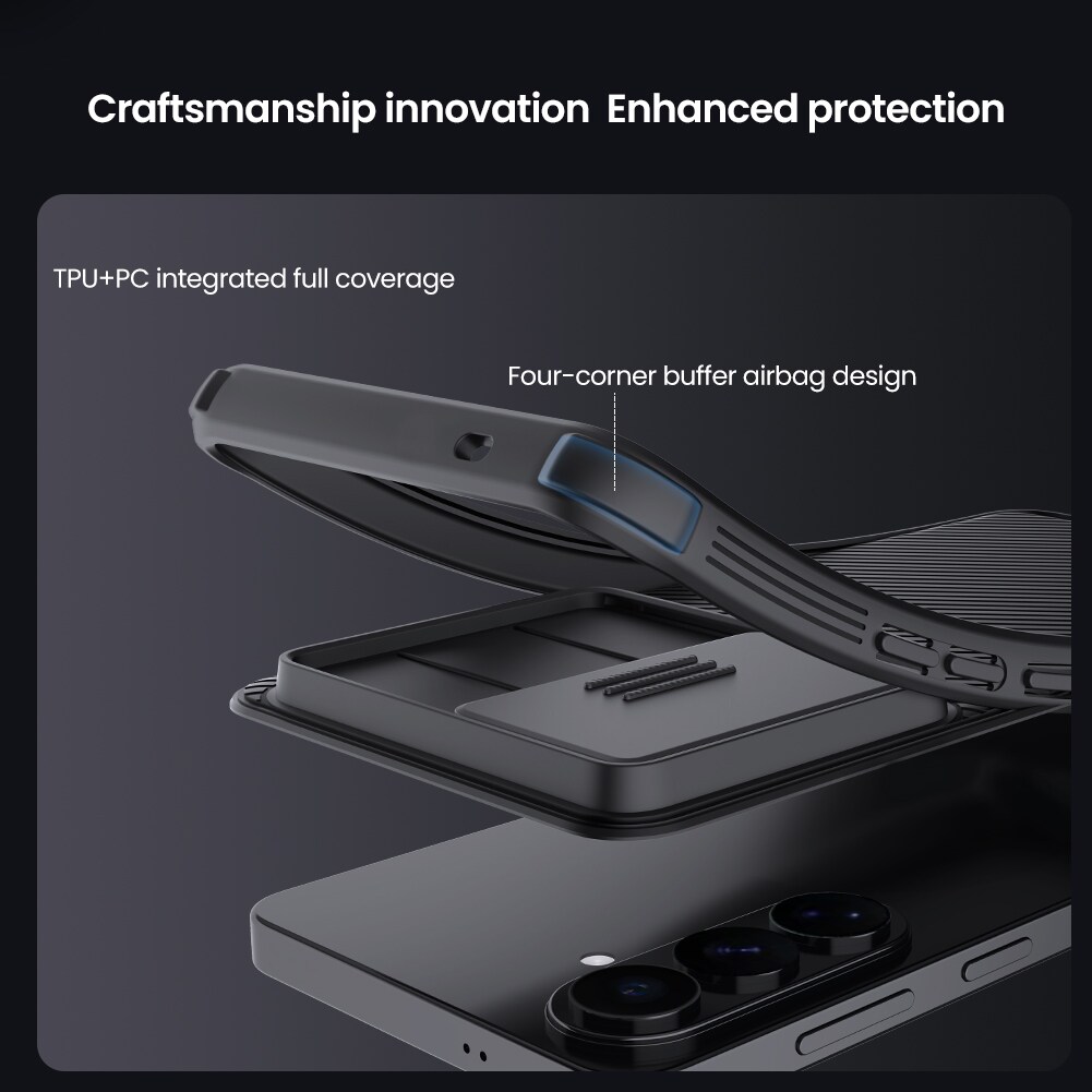 Beskyttende deksel med kameralokk og elegant design for Samsung Galaxy S26 fra Nillkin. Dette dekselet beskytter kameraet ditt mot riper og skader med et praktisk skyvelokk som enkelt trekkes foran kameraet når det ikke er i bruk.