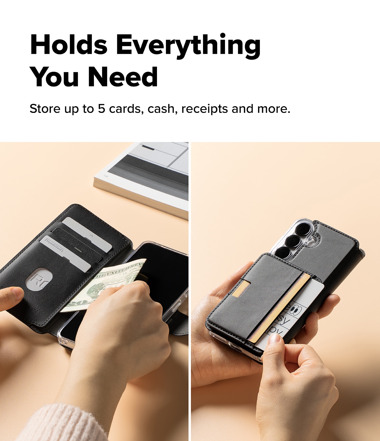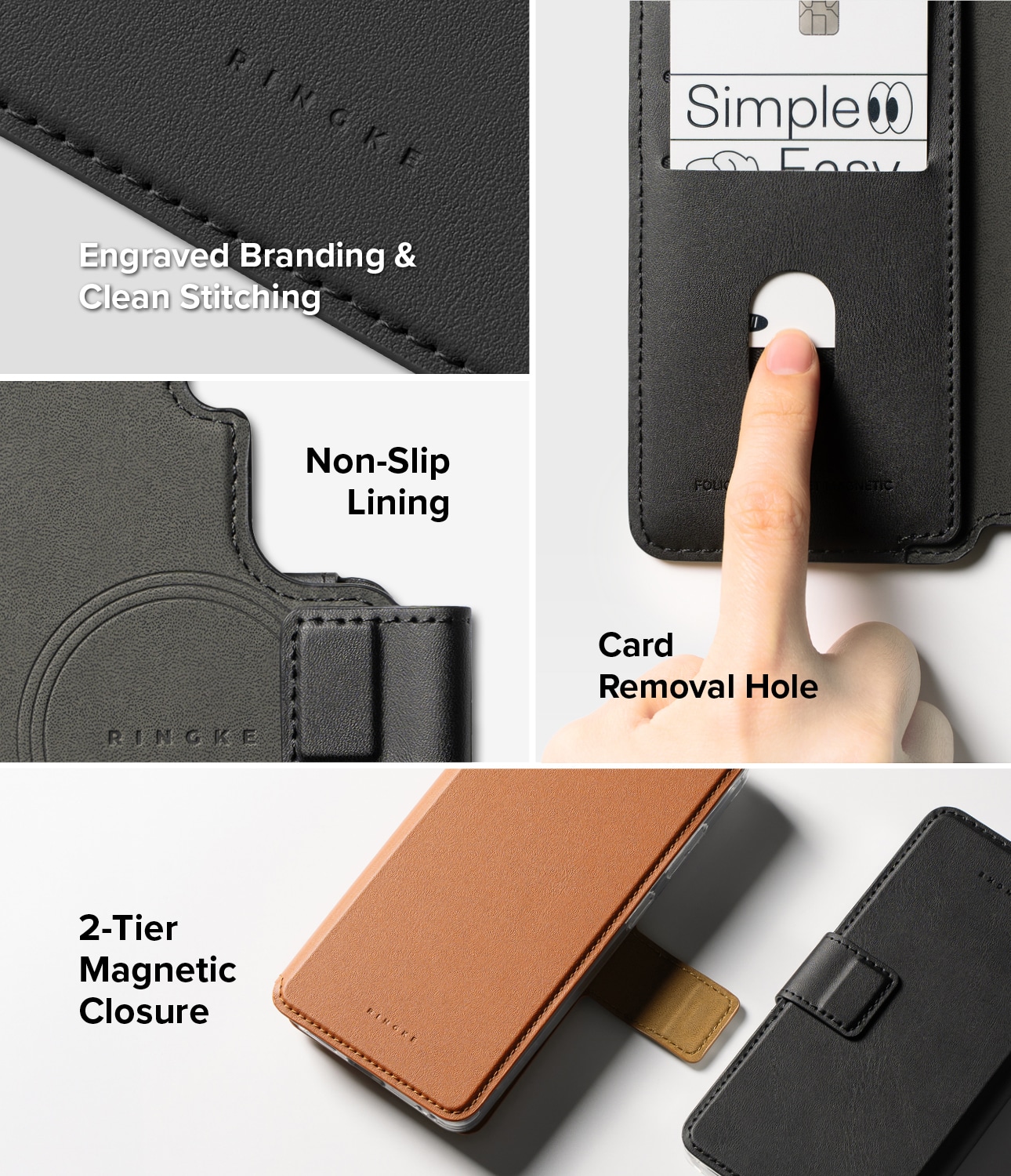 Magnetisk folio-lommebok med innebygd stativ fra Ringke for Samsung Galaxy S26. Lommeboken festes magnetisk på baksiden av telefonen eller på et MagSafe-kompatibelt deksel. Den har tre kortlommer i folioen samt en romslig skjult lomme for for eksempel sedler og kvitteringer.
