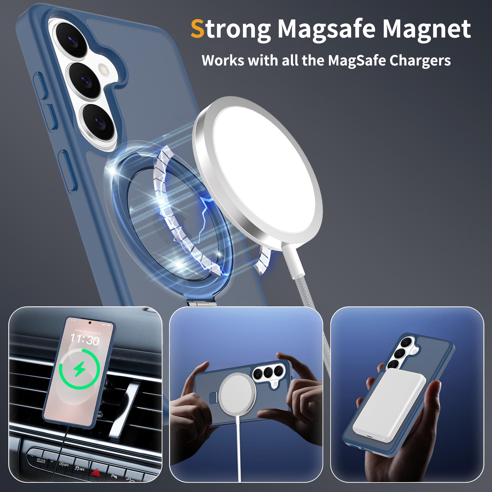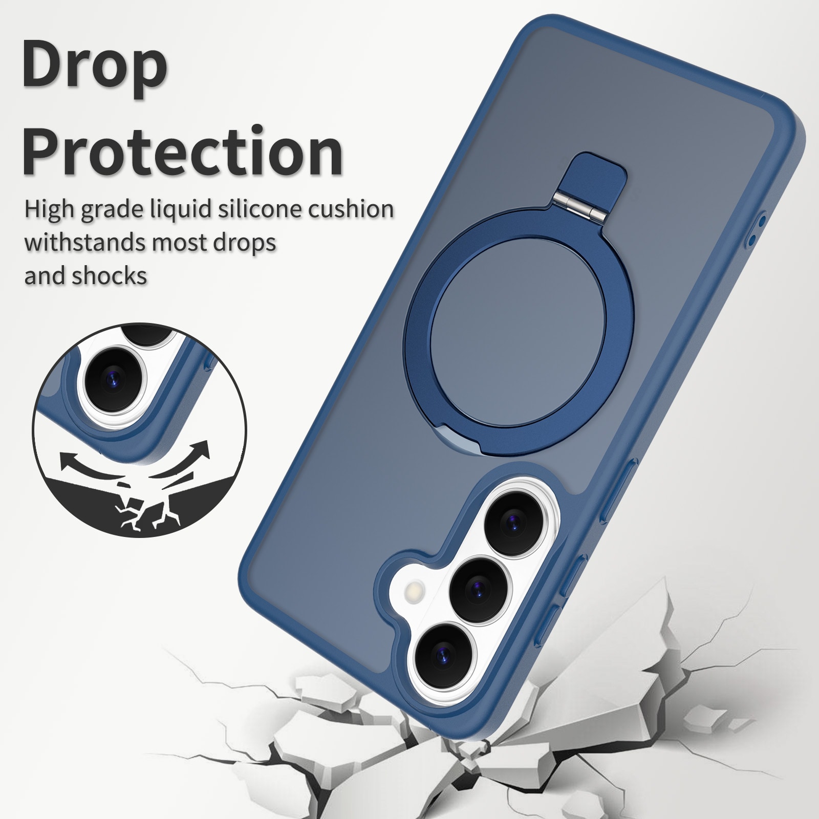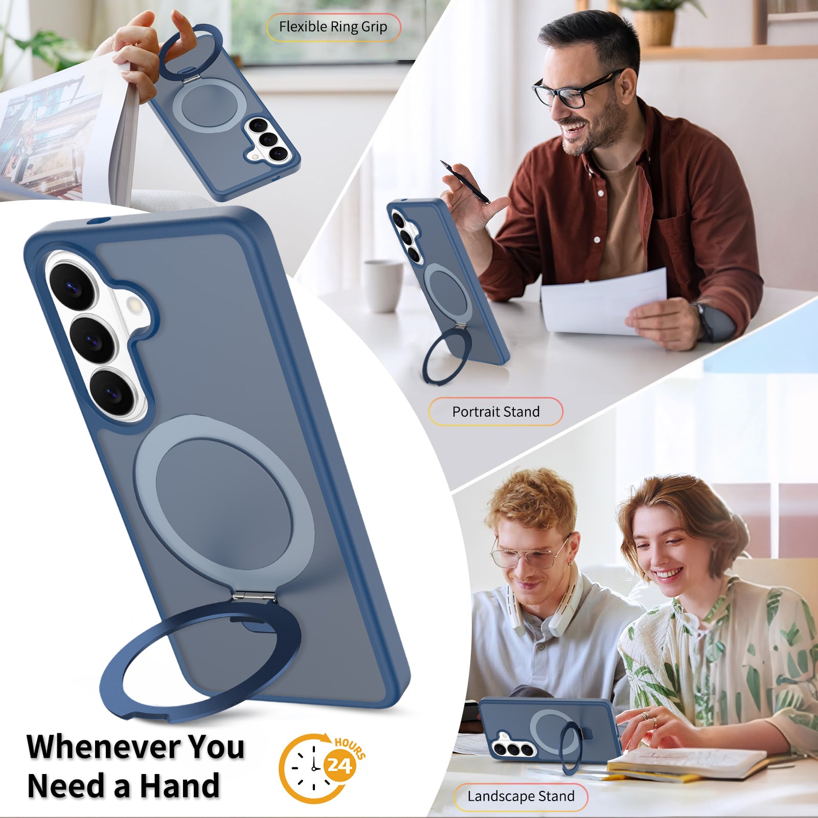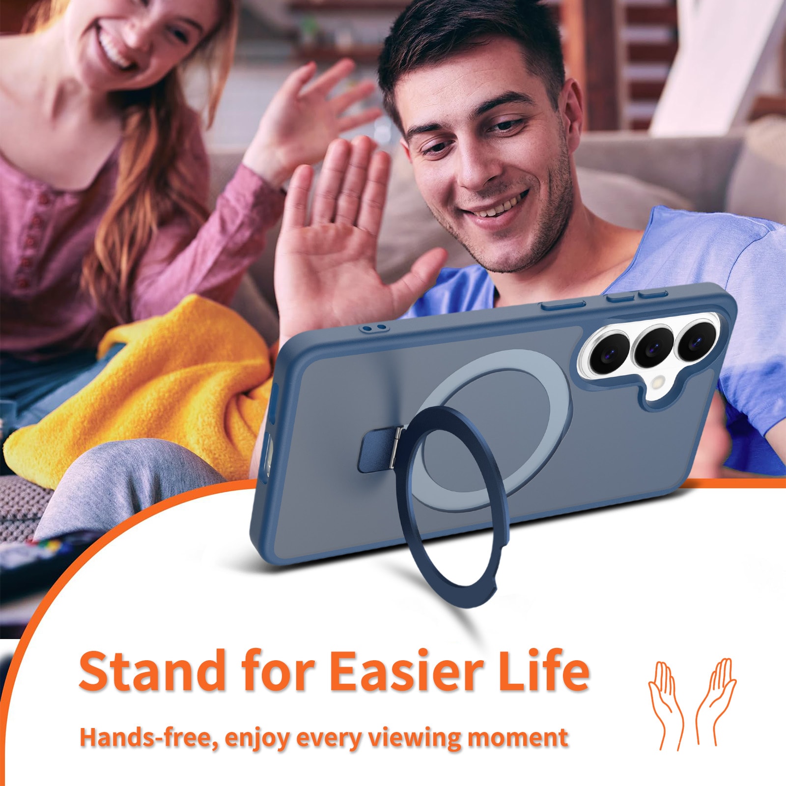 Mobildeksel med utfellbar MagSafe-ring for Samsung Galaxy S26 Plus. For å gi den beste beskyttelsen mot støt og fall, er dekselet todelt med en TPU-kjerne og et ytterlag i hard plast. Ringen på baksiden kan brettes ut for å gi et godt grep på telefonen. Ringen kan også danne et stativ for å se filmer, klipp eller spill.