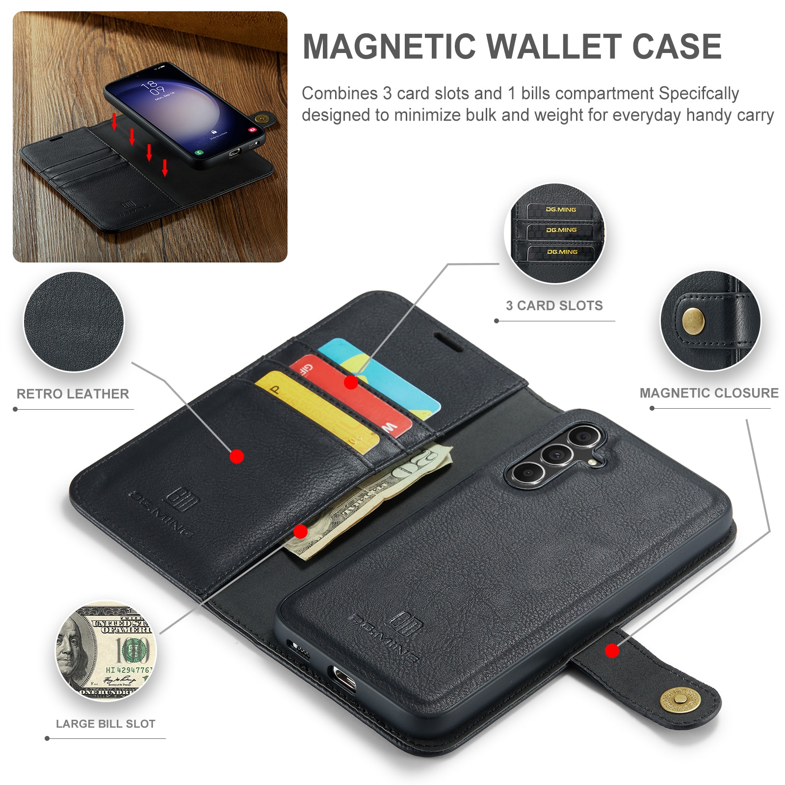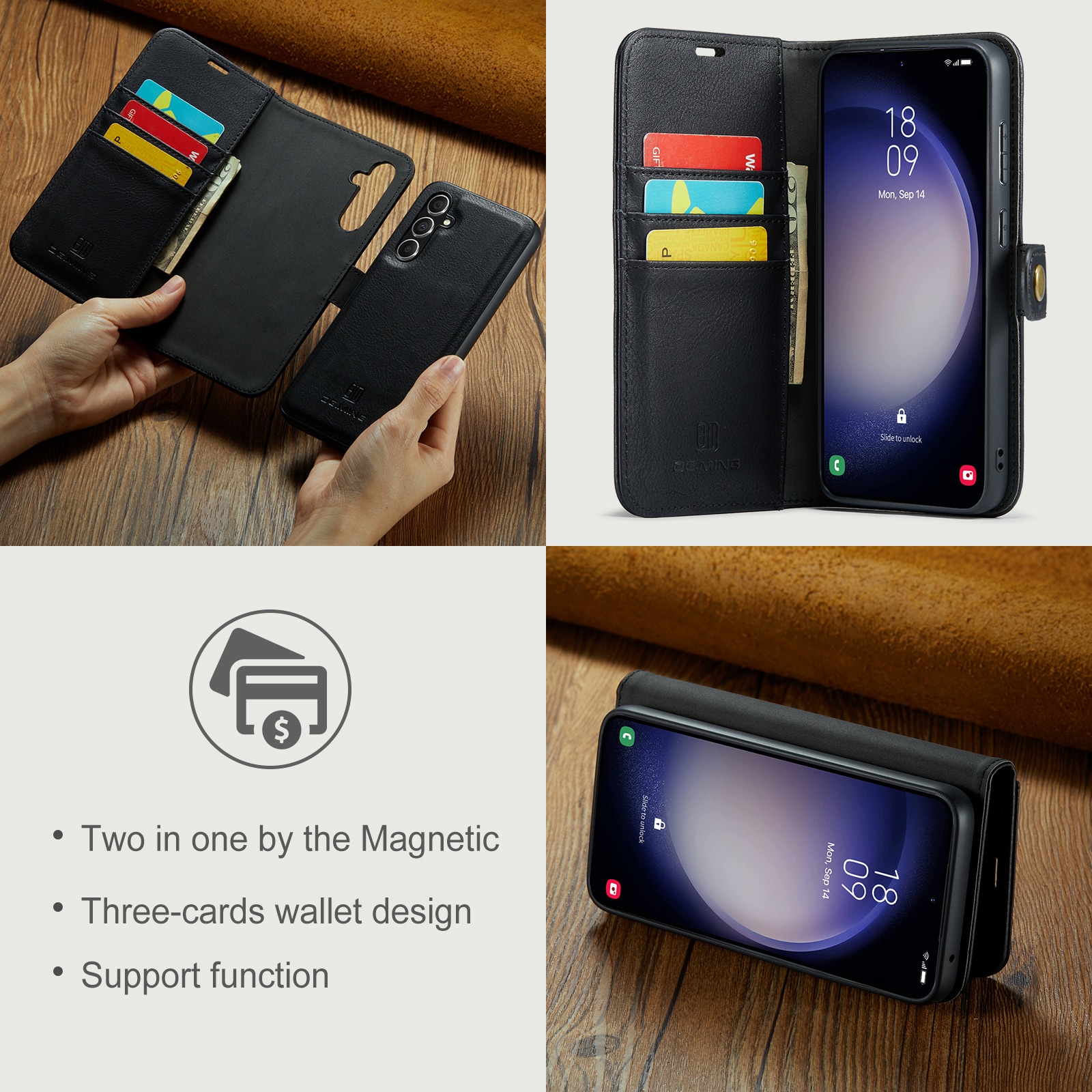 DG.MING etui med avtagbart magnetiskt deksel til Samsung Galaxy S26. Vesken har en klassisk og stilig design. Det avtagbare skallet betyr at du ikke trenger å bruke hele etui, for eksempel når du er hjemme eller på jobb.